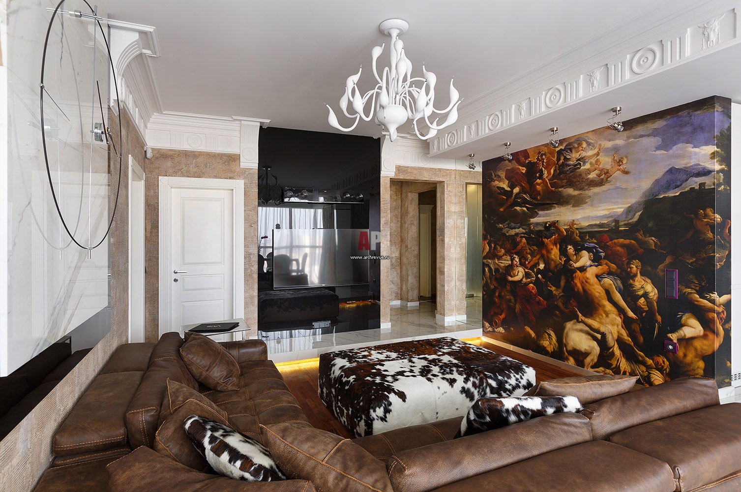 Перепады уровней в гостиной обусловлены технологическими причинами (под ними оборудована система водяного тёплого пола). Они выделены разными материалами (пакетом и белым с серыми прожилками керпамогранитом) и дополнены встроенной подсветкой. Настенные часы с каменным циферблатом, Nomon.