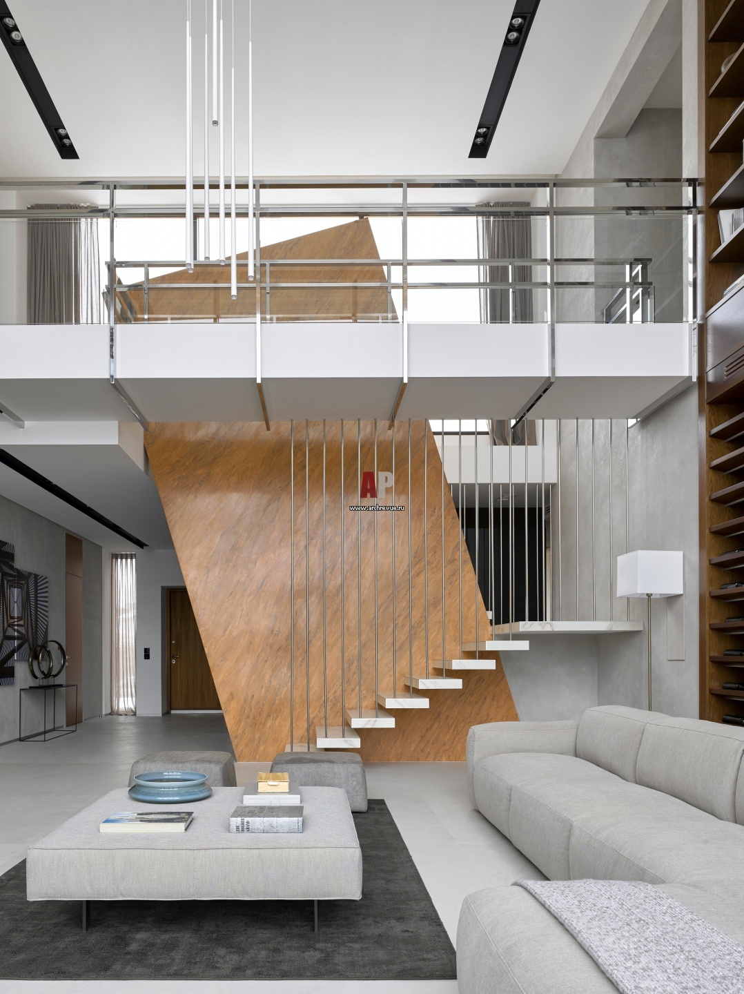 Зона гостиной с наклонным каменным пилоном. Лестница и исполинский каменный «айсберг» выполнены по индивидуальному проекту.