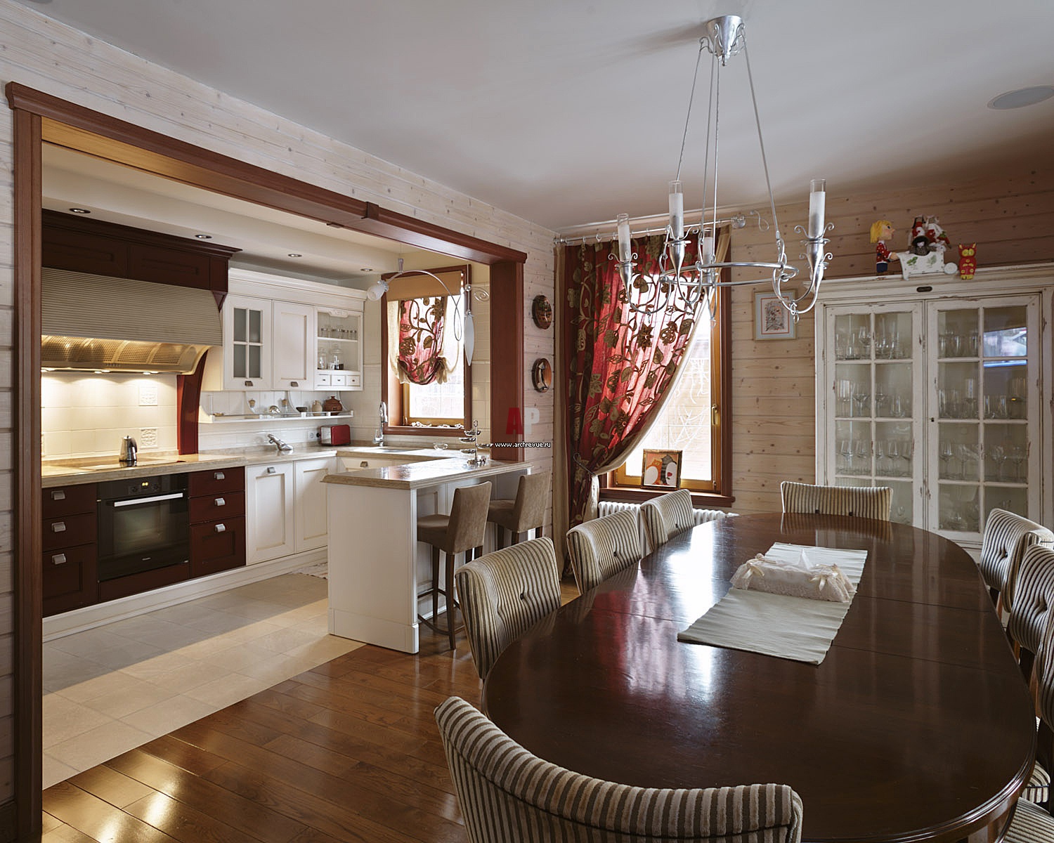 Фото интерьера столовой деревянного дома в стиле неоклассика