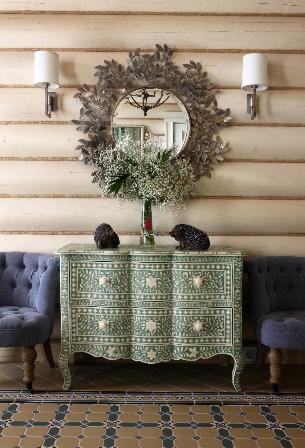 Восточную ноту в интерьер прихожей вносит комод с перламутровой инкрустацией.