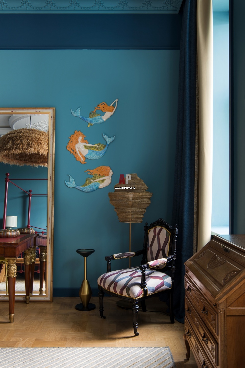 Хозяйская спальня. Рядом с ростовым зеркалом – композиция из керамических русалок.
