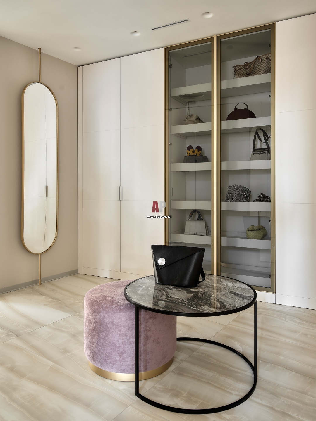 Интерьер дома с декоративными арками, светлым мрамором и молочным стеклом