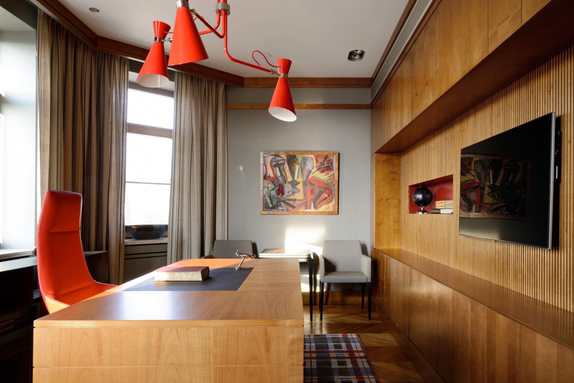 Интерьер кабинета. Встроенный шкаф с потайными дверцами в отделке шпоном клена насыщенного медового цвета выполнен на заказ. Рабочий стол, Morelato. Кресло, Arper. Красная люстра, Delightfull.