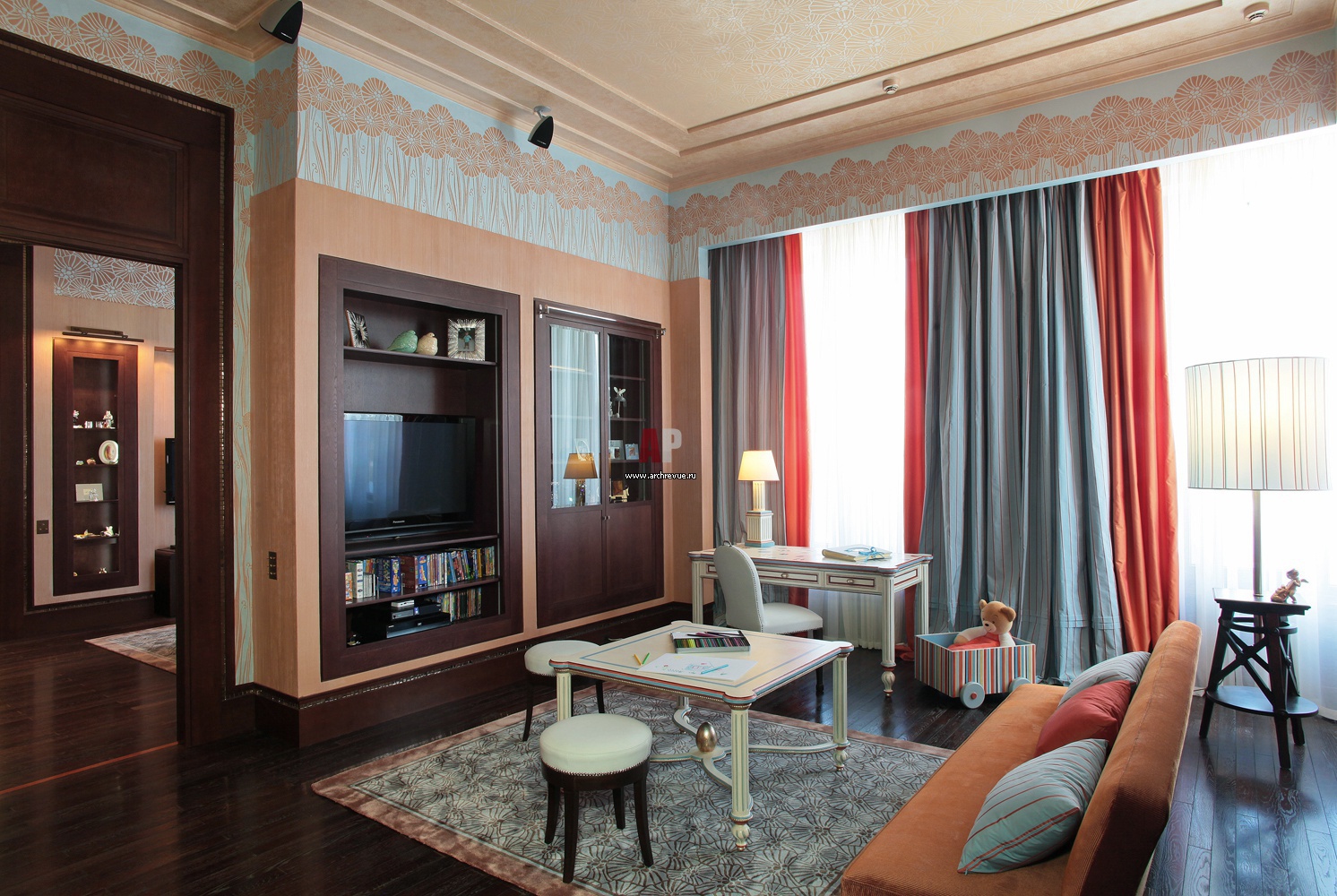 Детская представляет собой блок из четырех комнат: игровой, спальни и ванной с гардеробной. В интерьере тема цветка развивается в росписях и рисунке ковра, цвета при этом инвертированы. Мебель авторская.