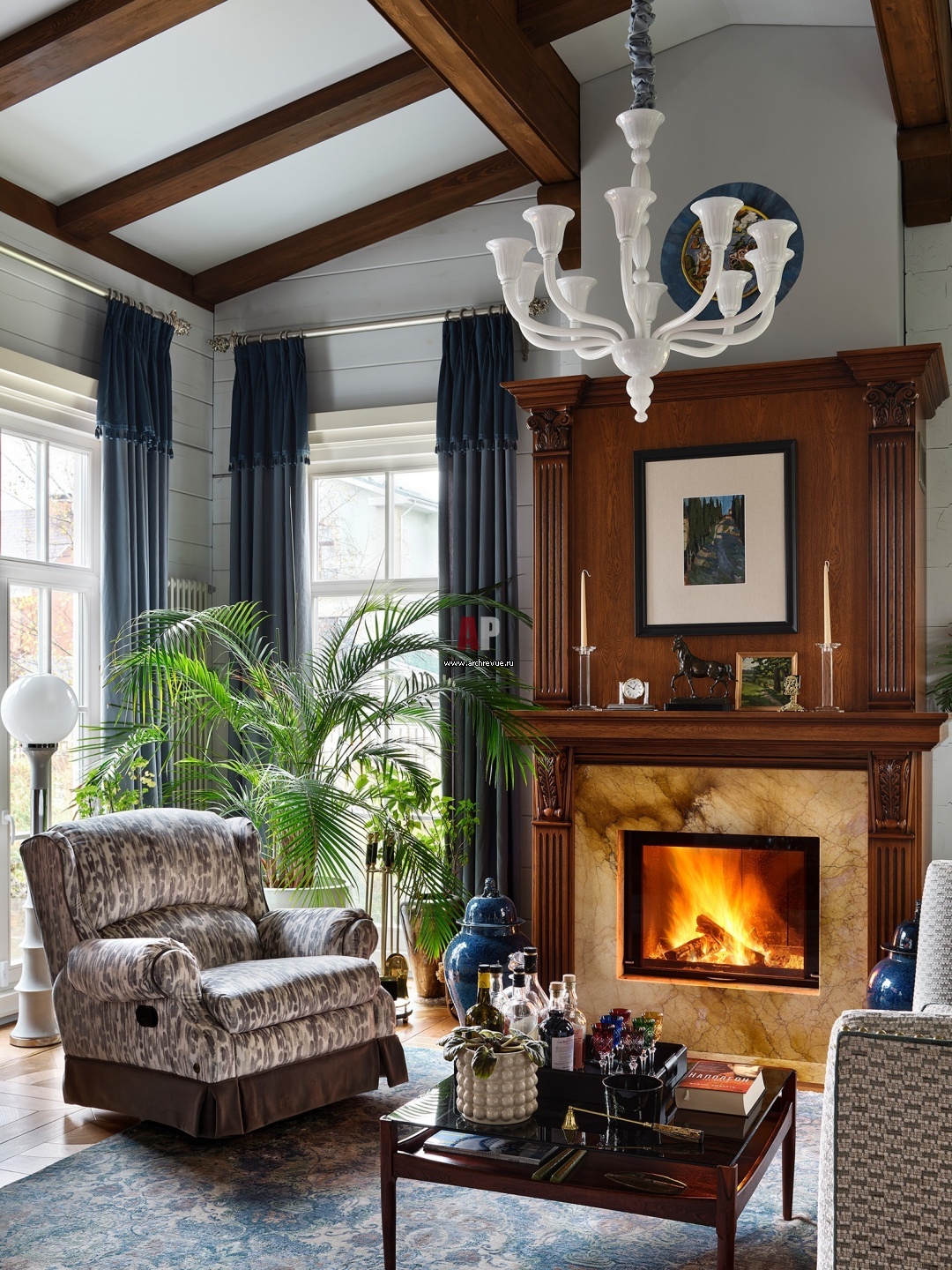 Каминная группа. Классический камин оформлен деревом и камнем.
