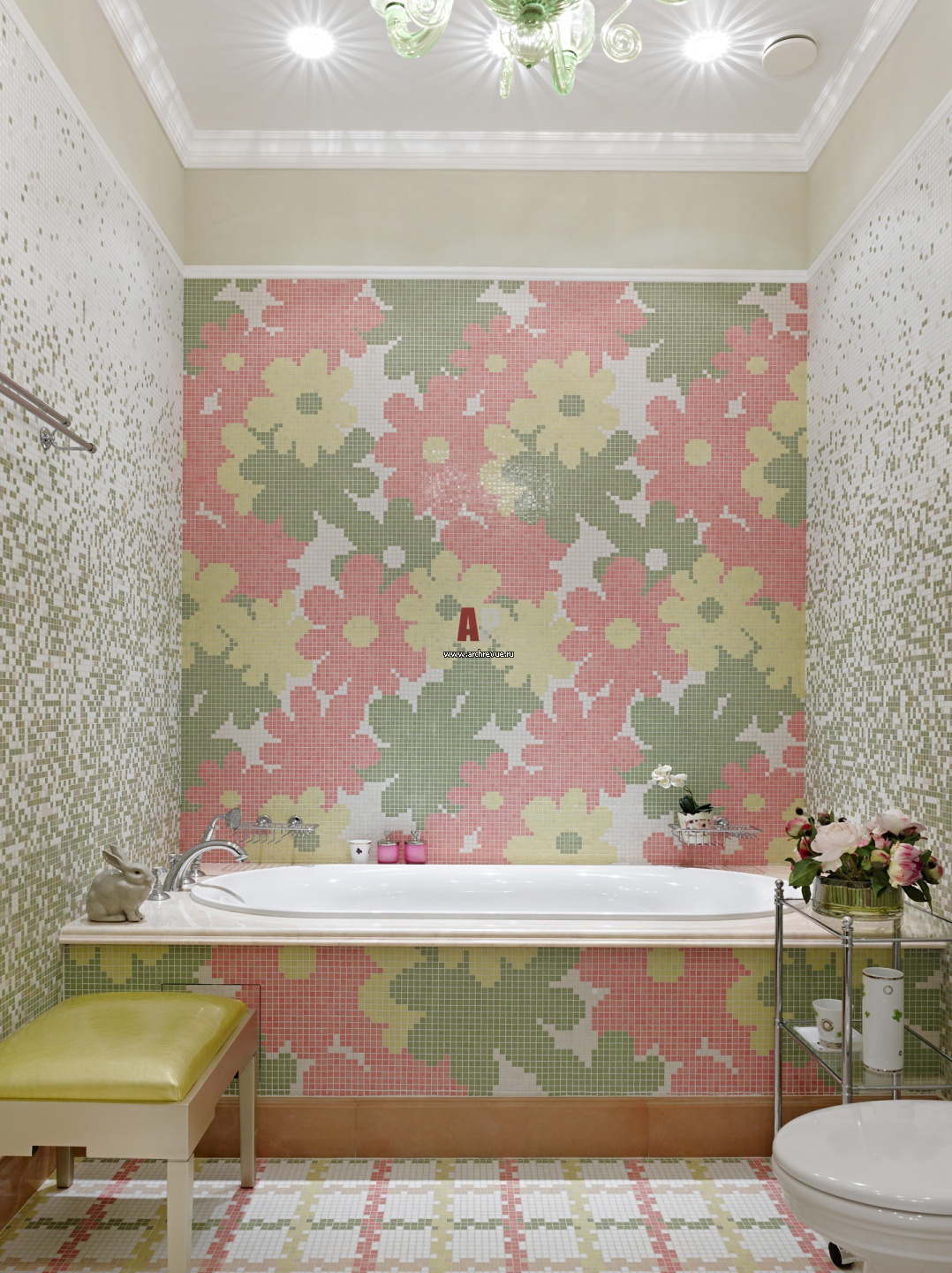 На фото – интерьер ванной комнаты с мозаикой в пастельных розовых и салатовых цветах.