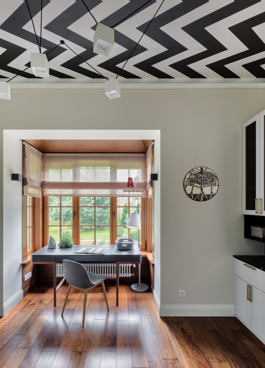 В кабинете акцент смещен на потолок, он черно-белым геометрическим орнаментом. Рабочая зона находится в эркере.
