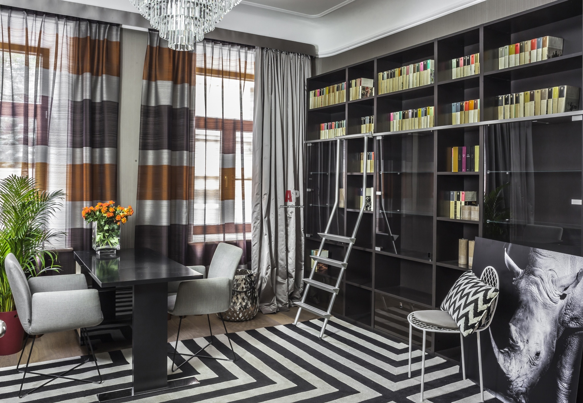 В интерьере кабинета-библиотеки просматриваются черты американского ар-деко. Стеллаж и рабочий стол, Interluebke. Текстиль и ковер с контрастным геометрическим орнаментом.