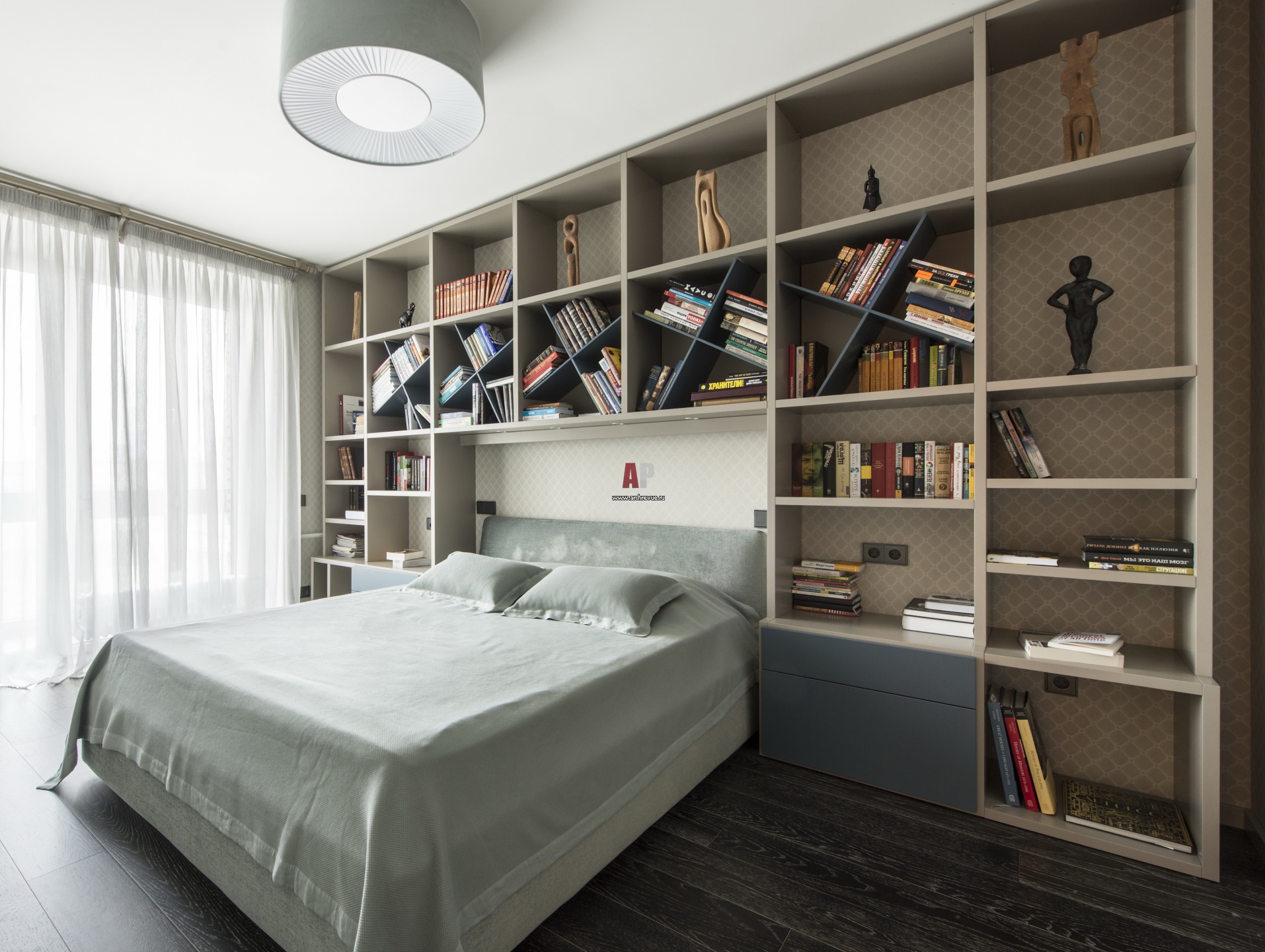 Изолированная спальня в мужской квартире. Обои двух оттенков, Zoffany. Кровать, Zanotta. Стеллаж, Presotto Italia.