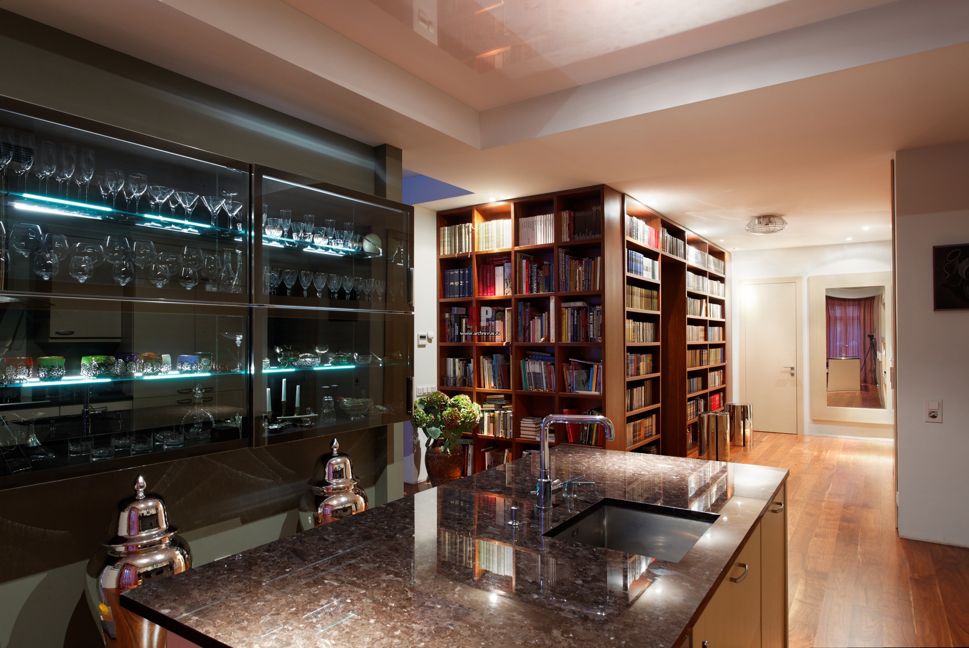 Вид из кухни на прихожую. Угловая библиотека из темного шпона сделана на заказ. За стеллажами – спальня.