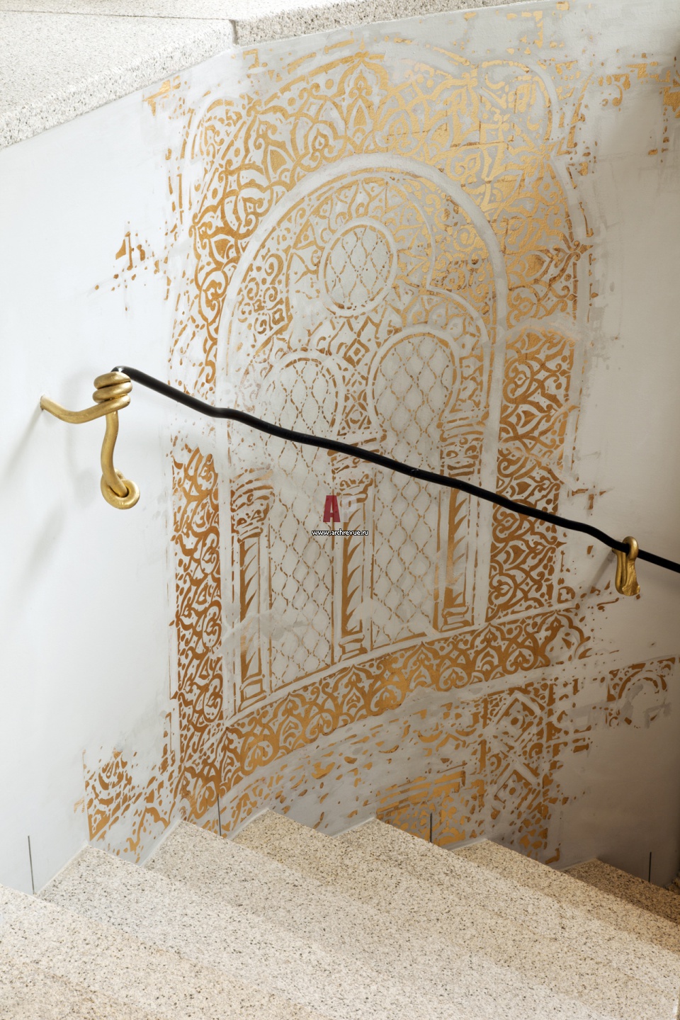 Лестница ведет на нижний уровень. Стены украшены золотой росписью.