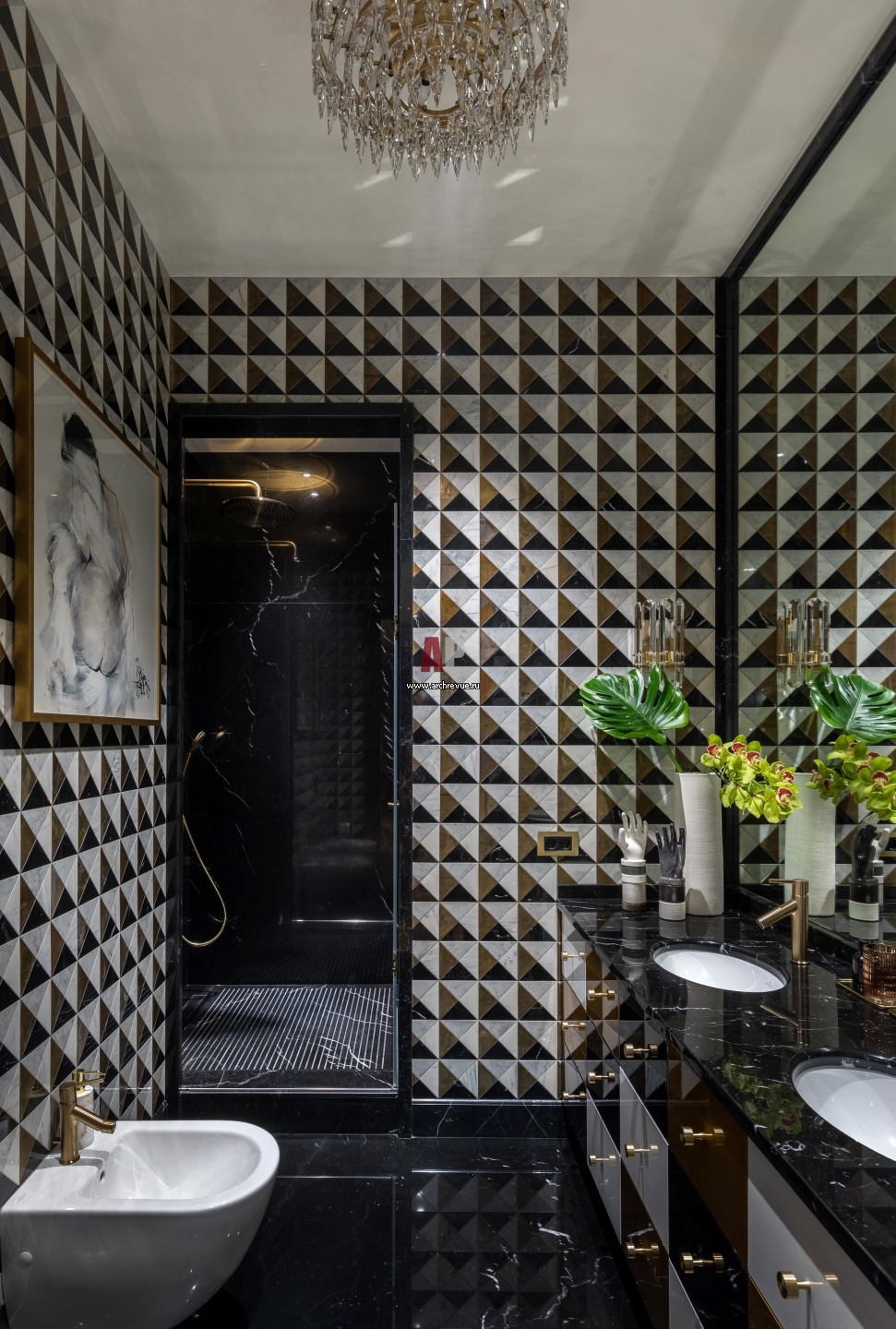 Санузел при главной спальне выглядит ярко и нарядно благодаря использованию черного мрамора и черно-белой каменной мозаике (мозаика сделана из мрамора Calacatta, Carrara, Bianco Carrara и Nero Marquina) с латунными вставками. Сантехника, Villeroy & Boch. Смесители, Axor, Hansgrohe.