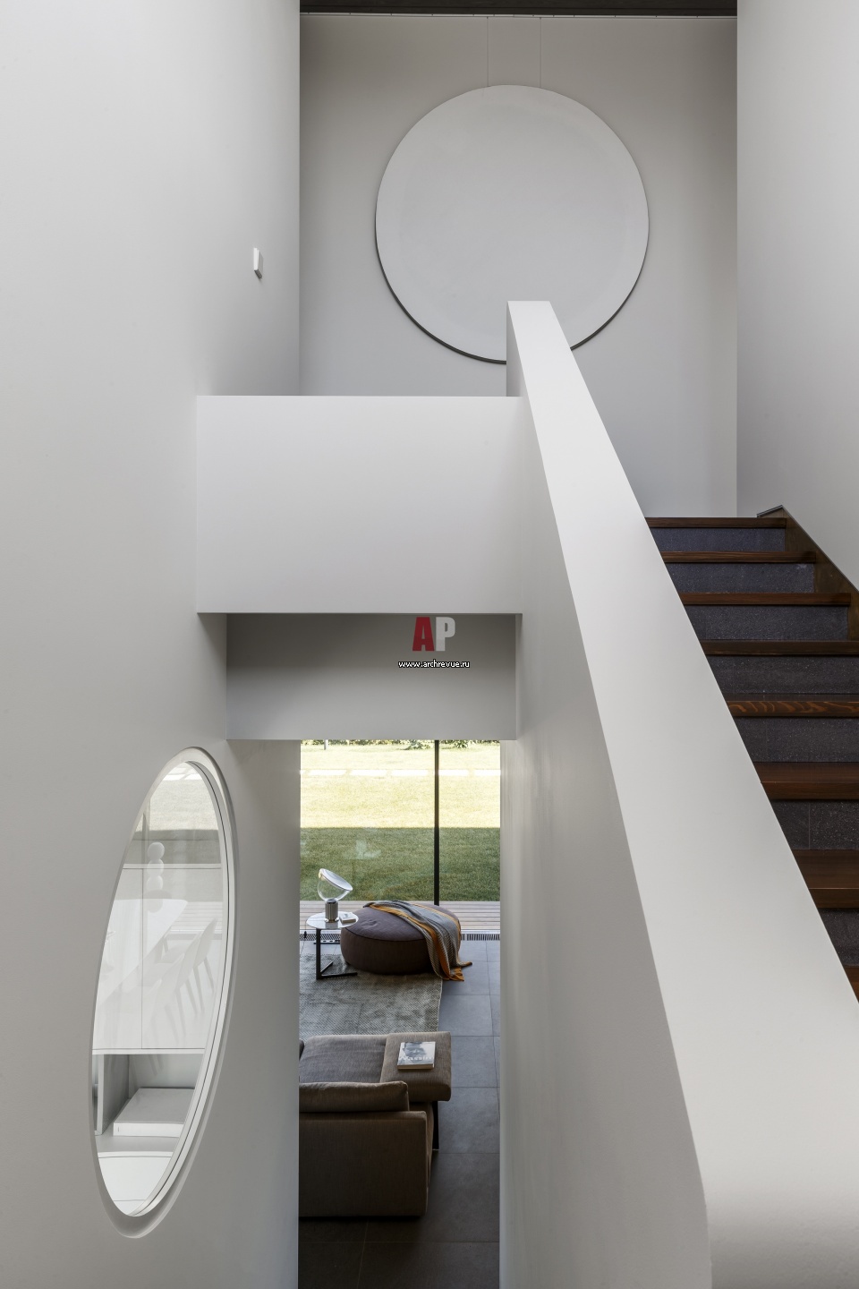 Декоративная особенность дома – обилие скрытых солярных символов. Окно-иллюминатор в зоне лестничного холла, круглые зеркала, подстолье для раковины в форме велосипеда.