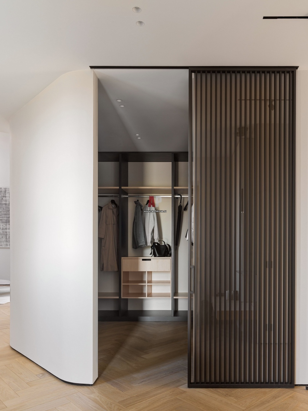 Гардеробная при входе имеет пластичную форму и контрастные раздвижные двери