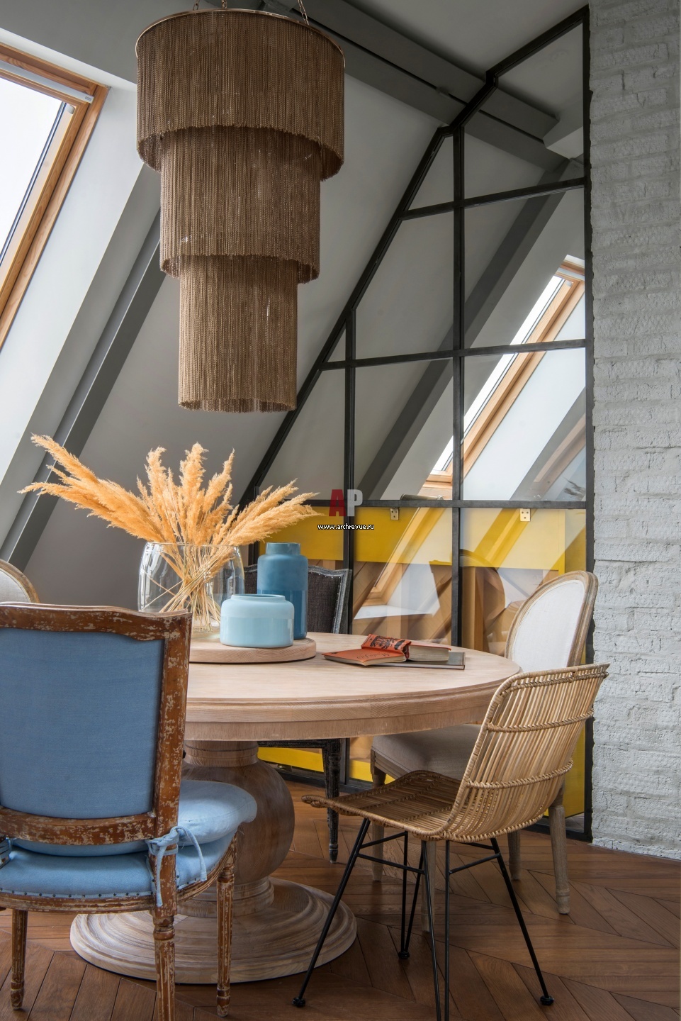 Чтобы сохранит ощущение света и воздуха, родные кирпичные стены выкрашены в светлый цвет, а вместо глухих перегородок использованы стеклянные лофт-перегородки.