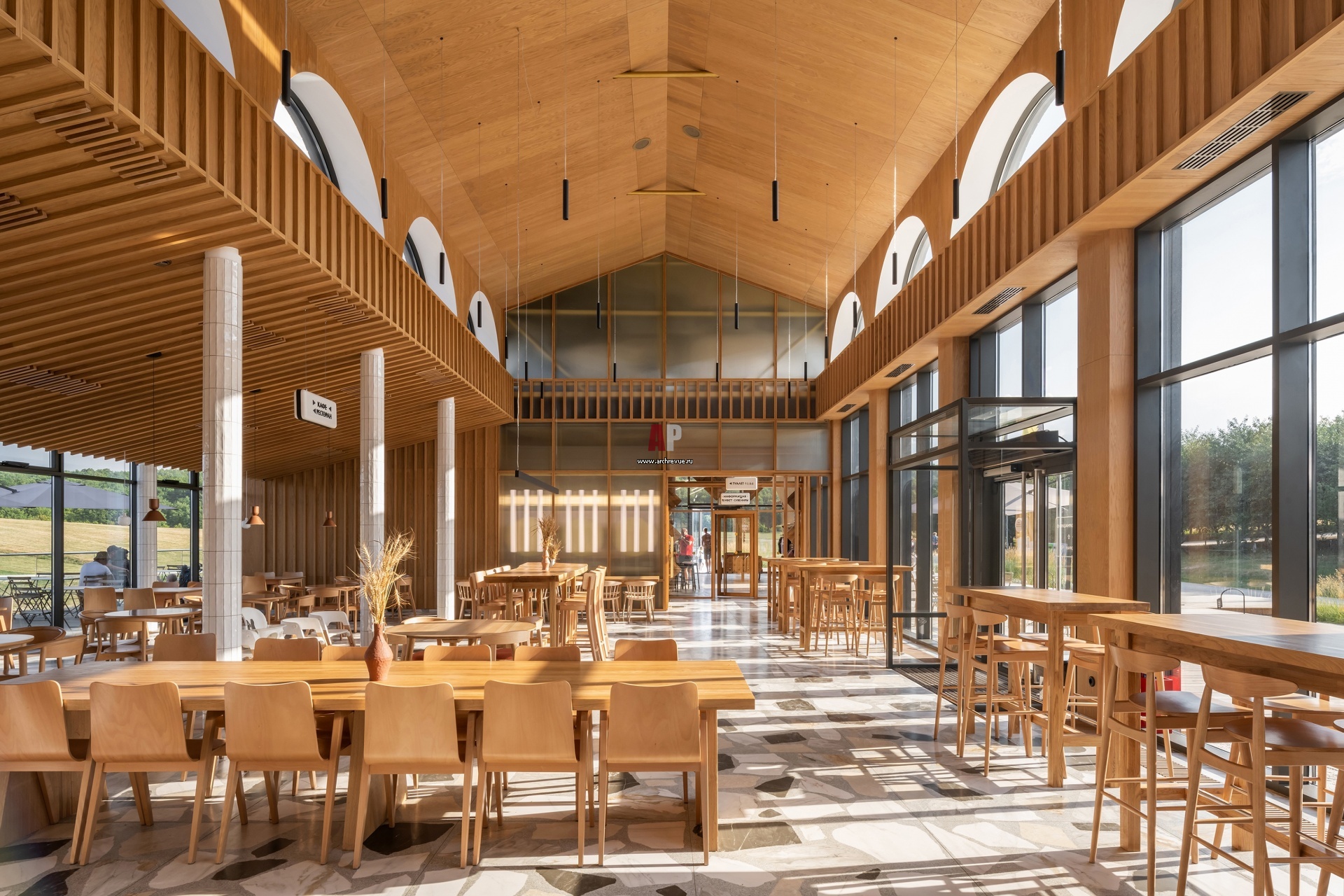 Интерьер кафе – объем с одним нефом – светлый и просторный. А полу – керамогранит, Vives, коллекция Nikoi.