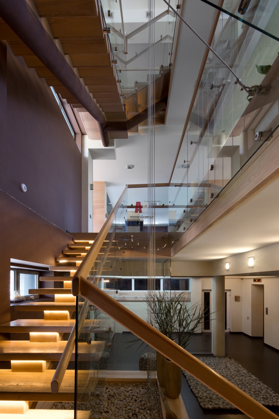 Центральная лестница пронизывает все пять уровней дома. Сплошные стеклянные перила лестницы обеспечивают безопасность детей. Ступени и перила деревянные со скругленными краями.