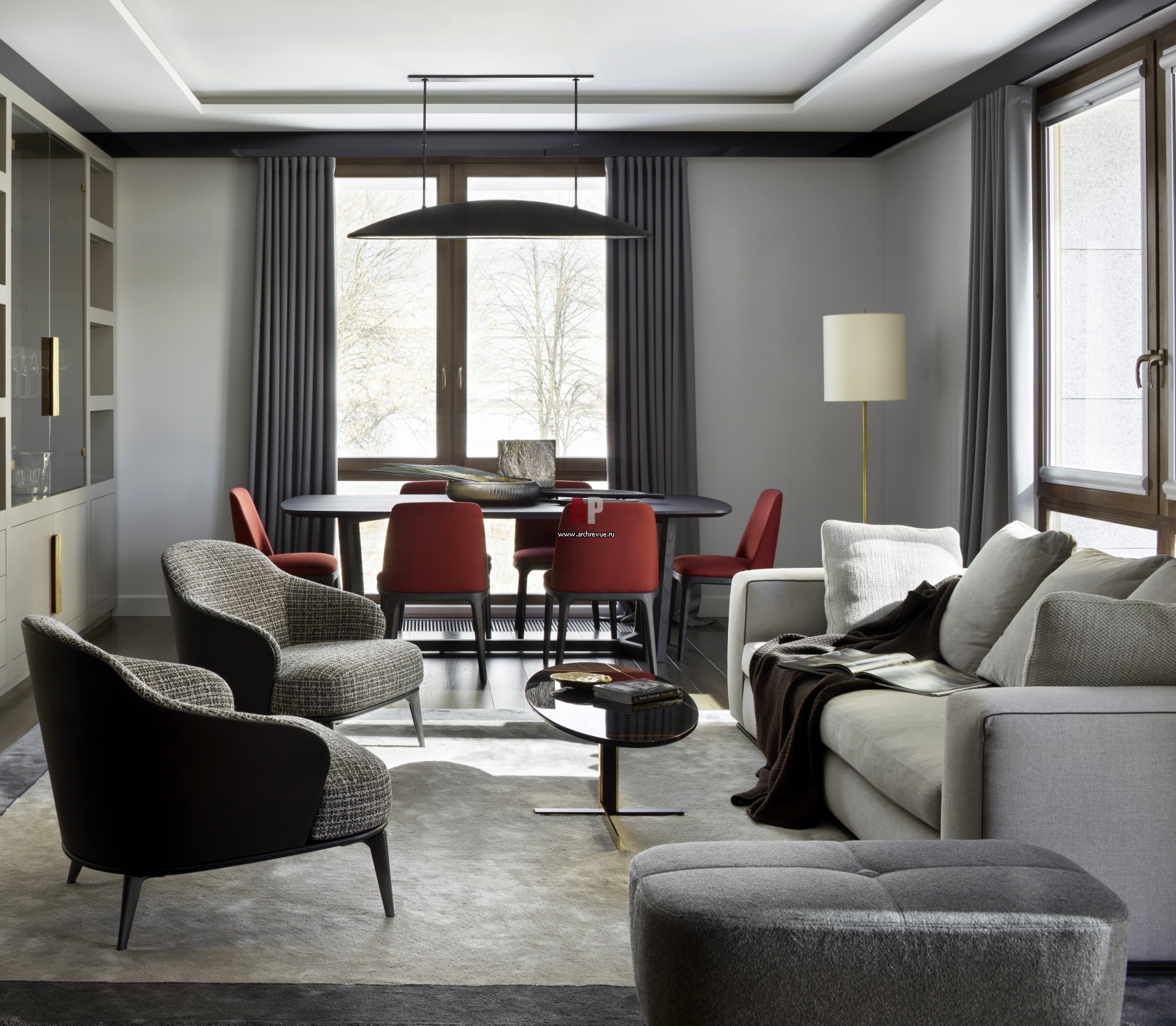 Интерьер гостиной выполнен в дымчатой палитре с кораллово-красными акцентами. Диван, кресла, журнальный столик, пуф, Minotti. Обеденная группа, Poliform. Светильник, Visual Comfort & Co by Kelly Wearstler.