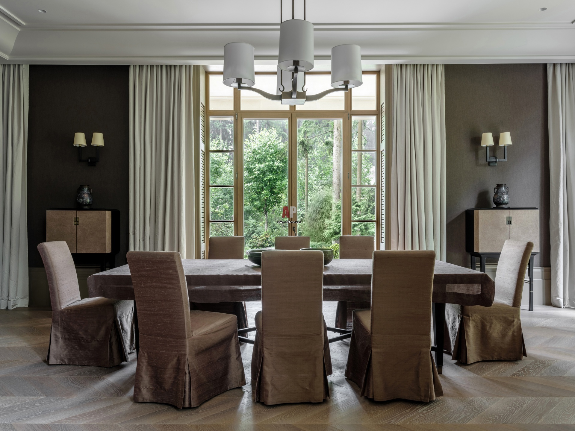 Столовая находится напротив кабинета, оба помещения выполнены в темных коричневых оттенках. Обеденный стол сделан на заказ. Стулья, Meridiani. Люстра, Lorenzo Tondelli.