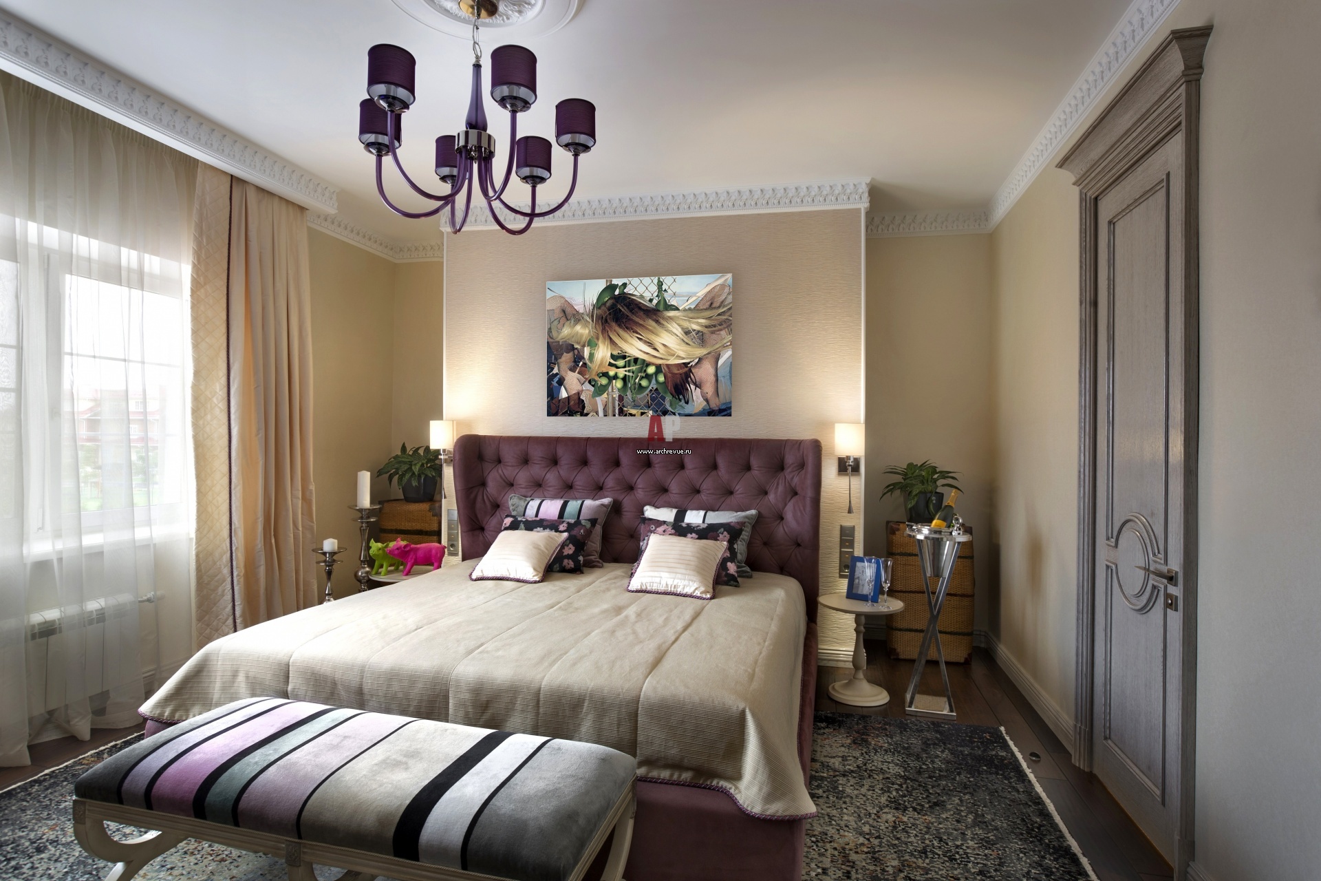 В хозяйской спальне тему путешествий продолжают два больших плетеных Сундука, расположенных в нишах по обе стороны от кровати. На кроватью – работа художника Джеффа Кунса.