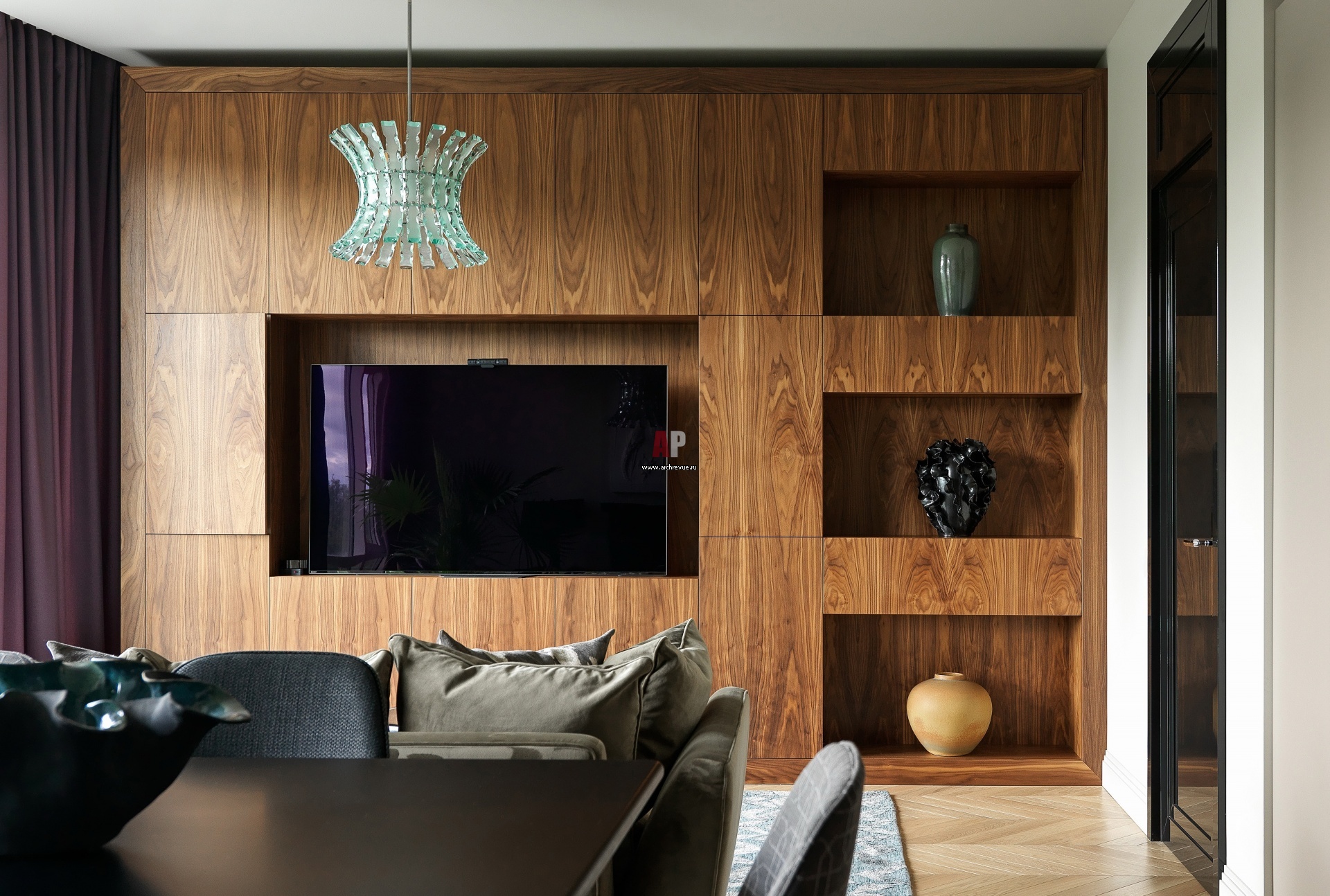 Чтобы внести в интерьер уют, дизайнеры использовали дерево с активной фактурой. Вся торцевая стена помещения отделана панелями из шпона ореха. В композицию встроена зона ТВ, а за панелями скрыта библиотека и другие приятные мелочи. Глубина встроенных шкафов составляет 33 см.