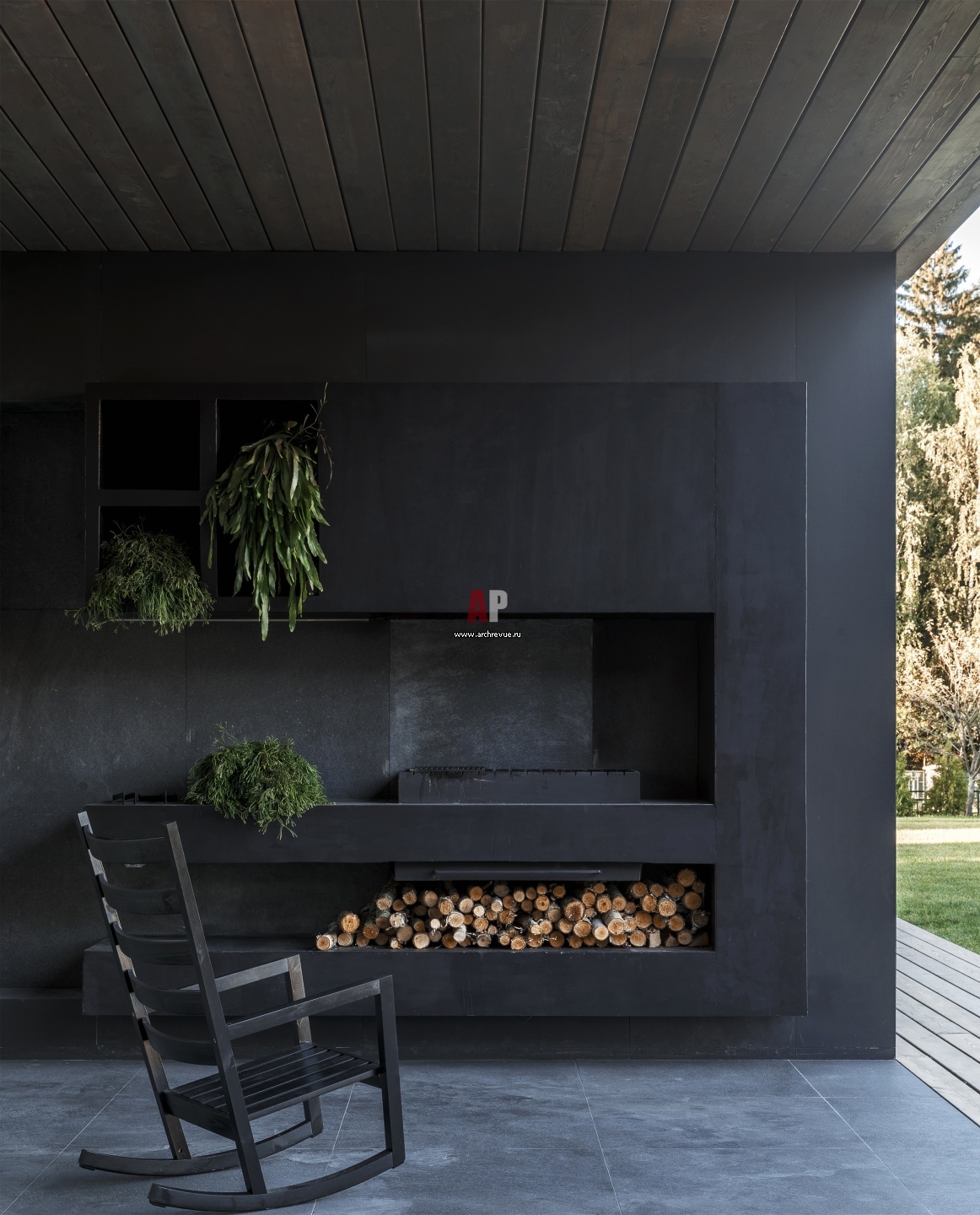 Веранда выглядит строго и брутально за счет отделки камина черным камнем. На полу –крупноформатный керамогранит (1000Х300) серого цвета, Grespania. Металлический мангал изготовлен по эскизам архитектора.