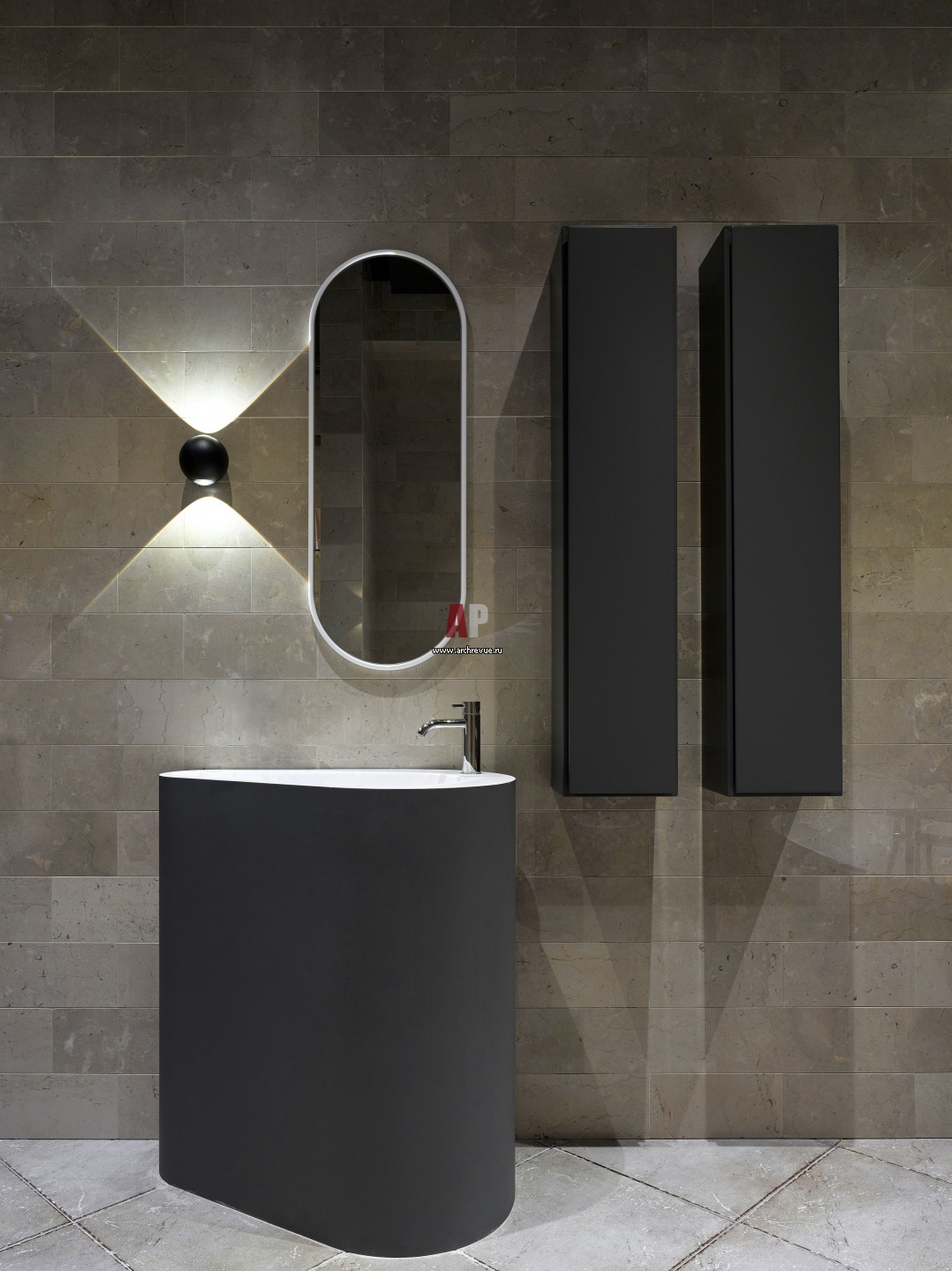 Хозяйская ванная комната выдержана в темной палитре. Футуристический черный умывальник, Rexa Design. Вертикальные шкафчики, Rexa Design.