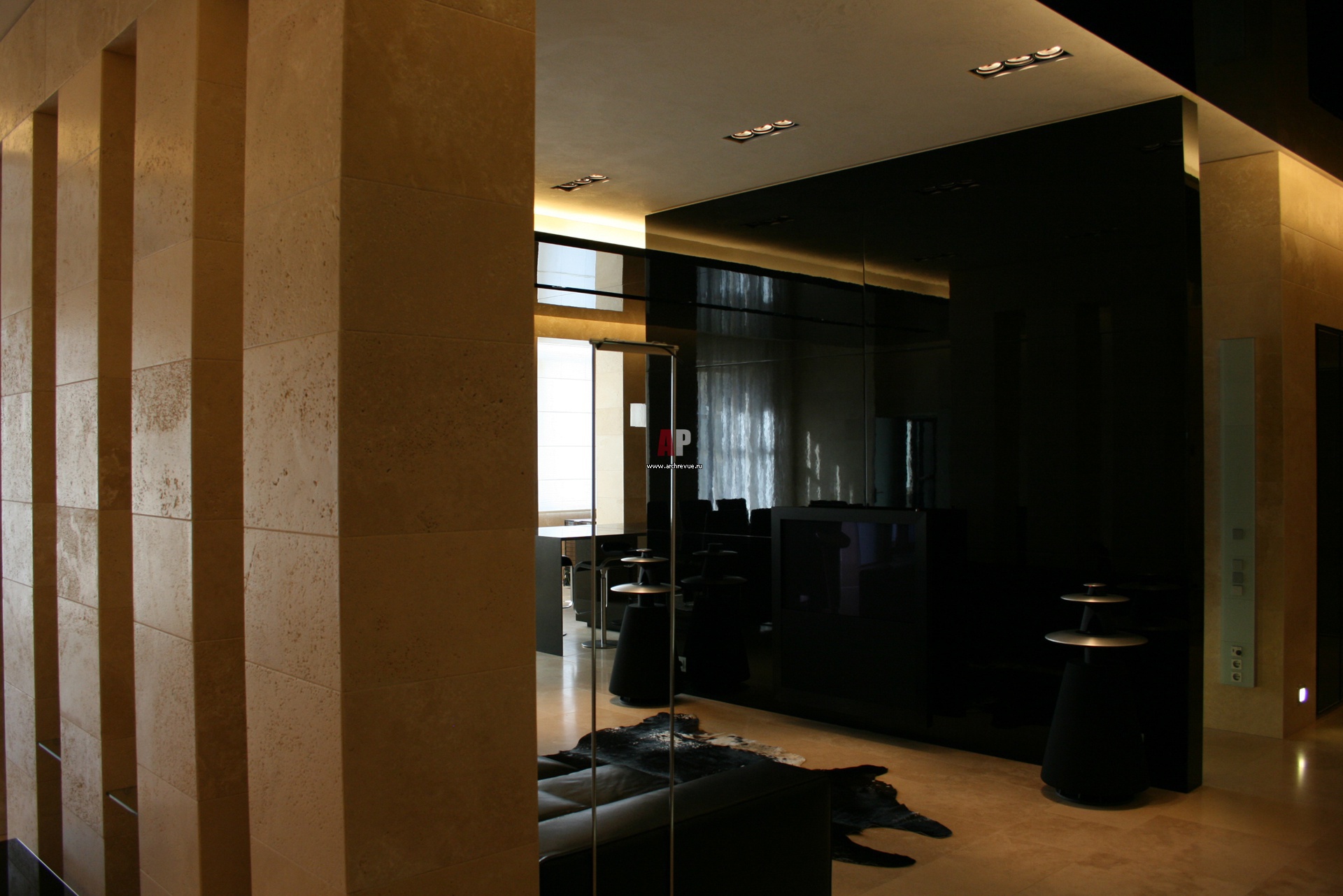 Динамику в интерьер вносят плоскости, обшитые панелями из МДФ с черным глянцевым покрытием, производитель «Техноформ». В них, как в зеркале, отражается и преломляется фрагменты обстановки.