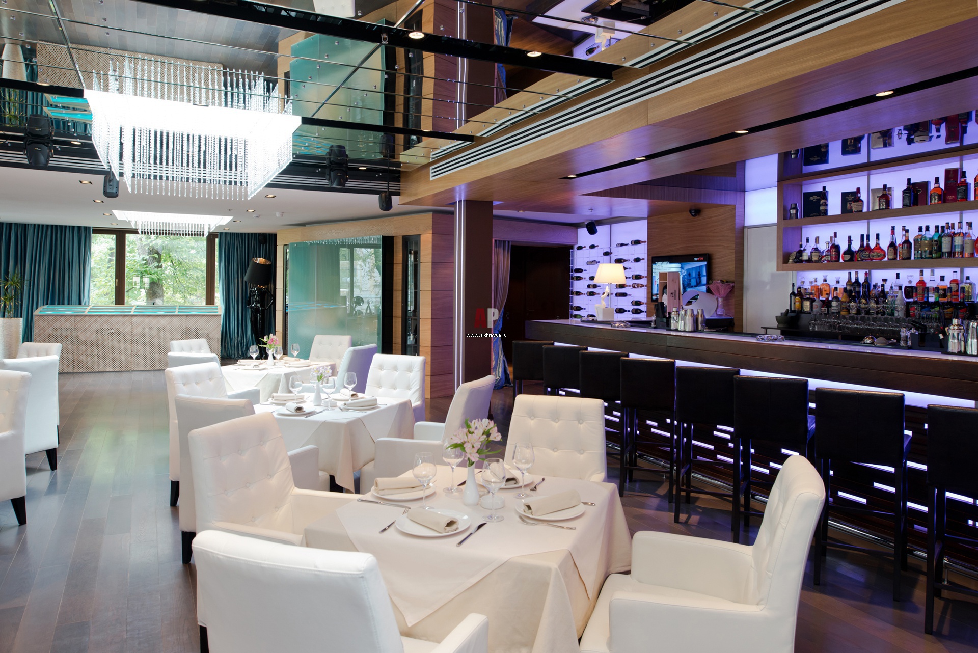 Зал ресторана с барной стойкой. Главный зал объединяет в себе несколько зон: бар, подиум, VIP-зал, каминный зал.