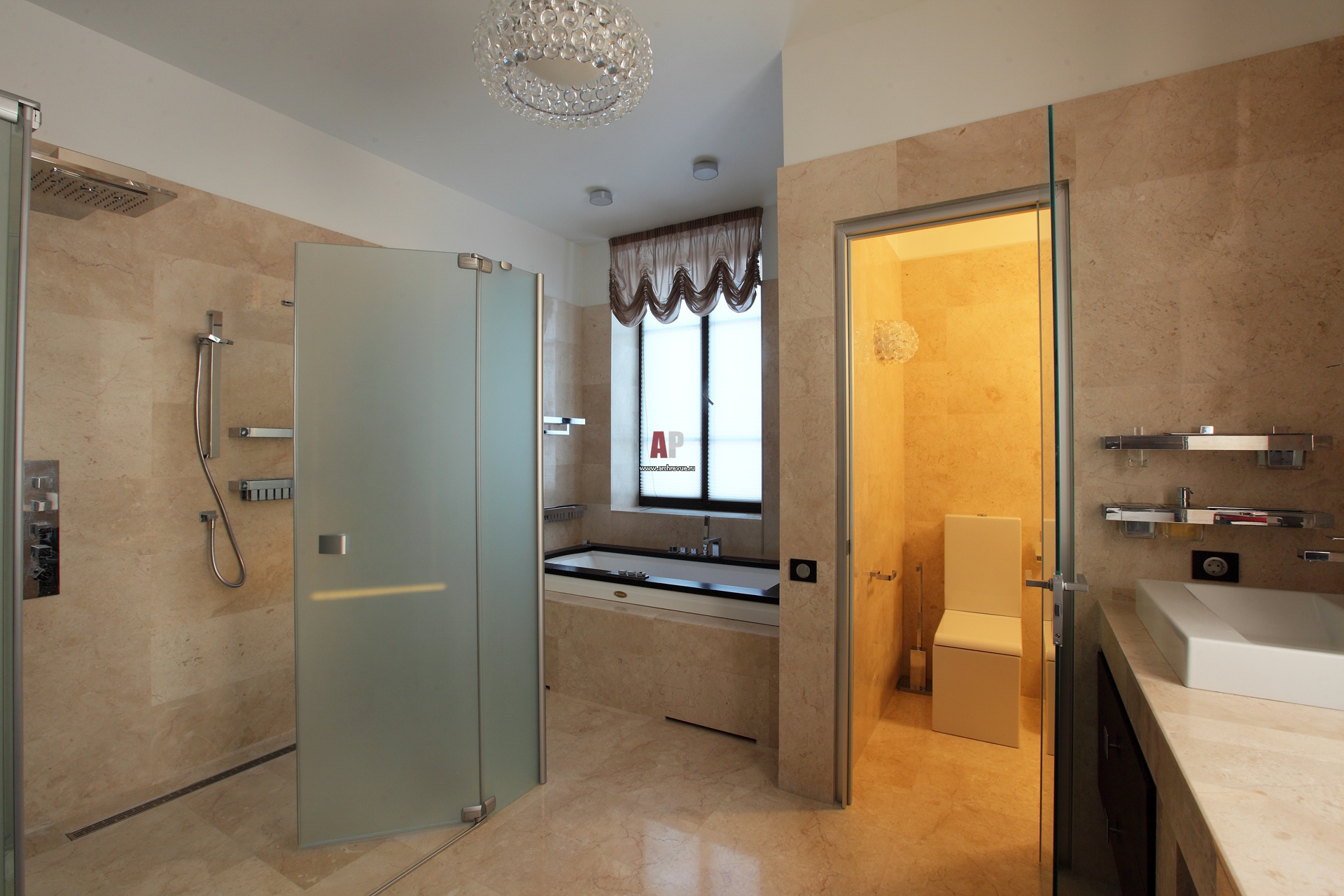 Хозяйская ванная комната занимает большую площадь. Встроенная ванна расположена у окна. Рядом с ней – душевая в строительном исполнении. Туалеты расположены за перегородкой. Стены облицованы керамогранитом светло-бежевого цвета.