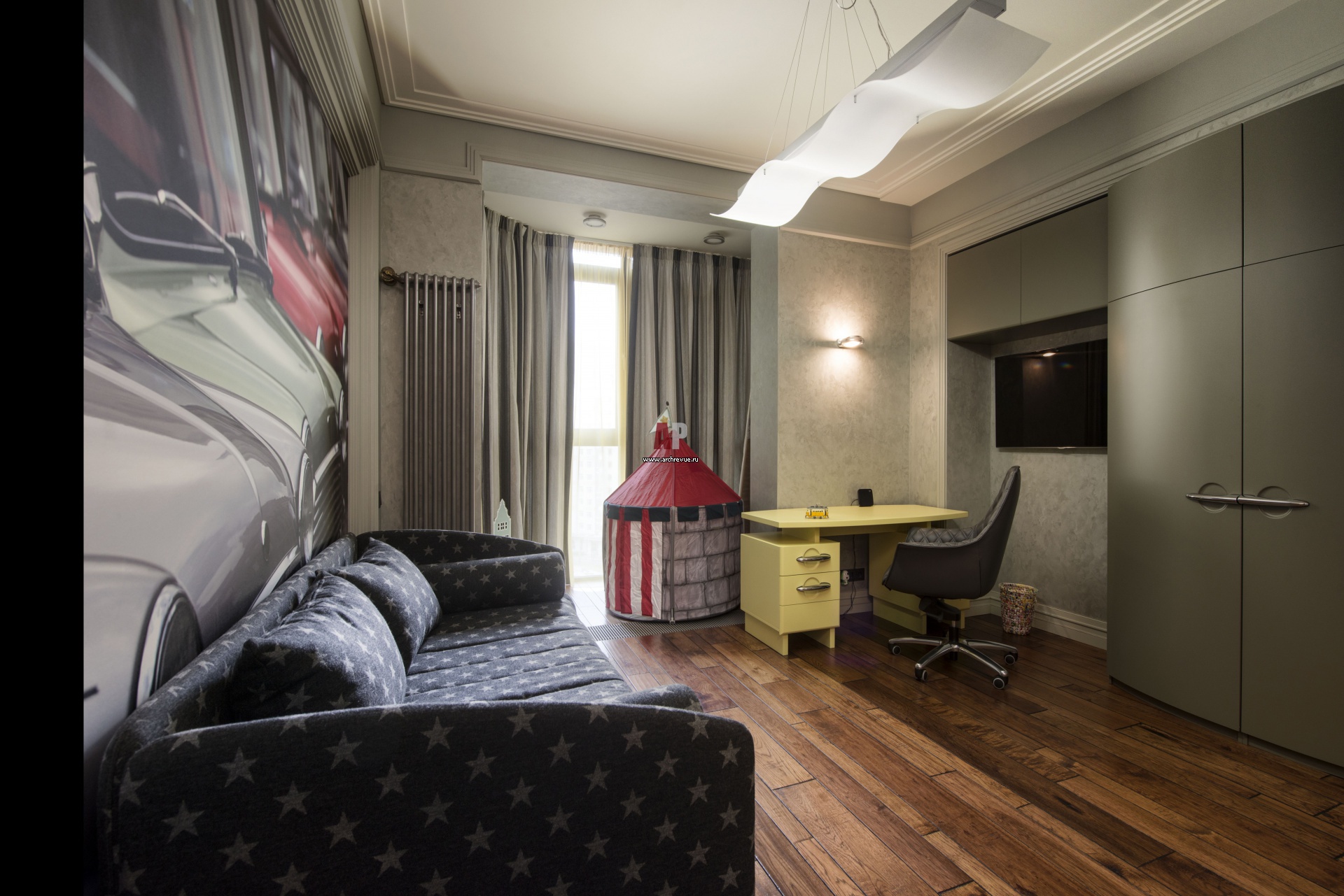 Интерьер современной детской. Как и во всей квартире, в отделке стен помещения использована декоративная штукатурка коричневого цвета, а также фотообои. Синий диван со звездами, Danti. Стол, шкаф, на заказ по эскизам архитекторов.