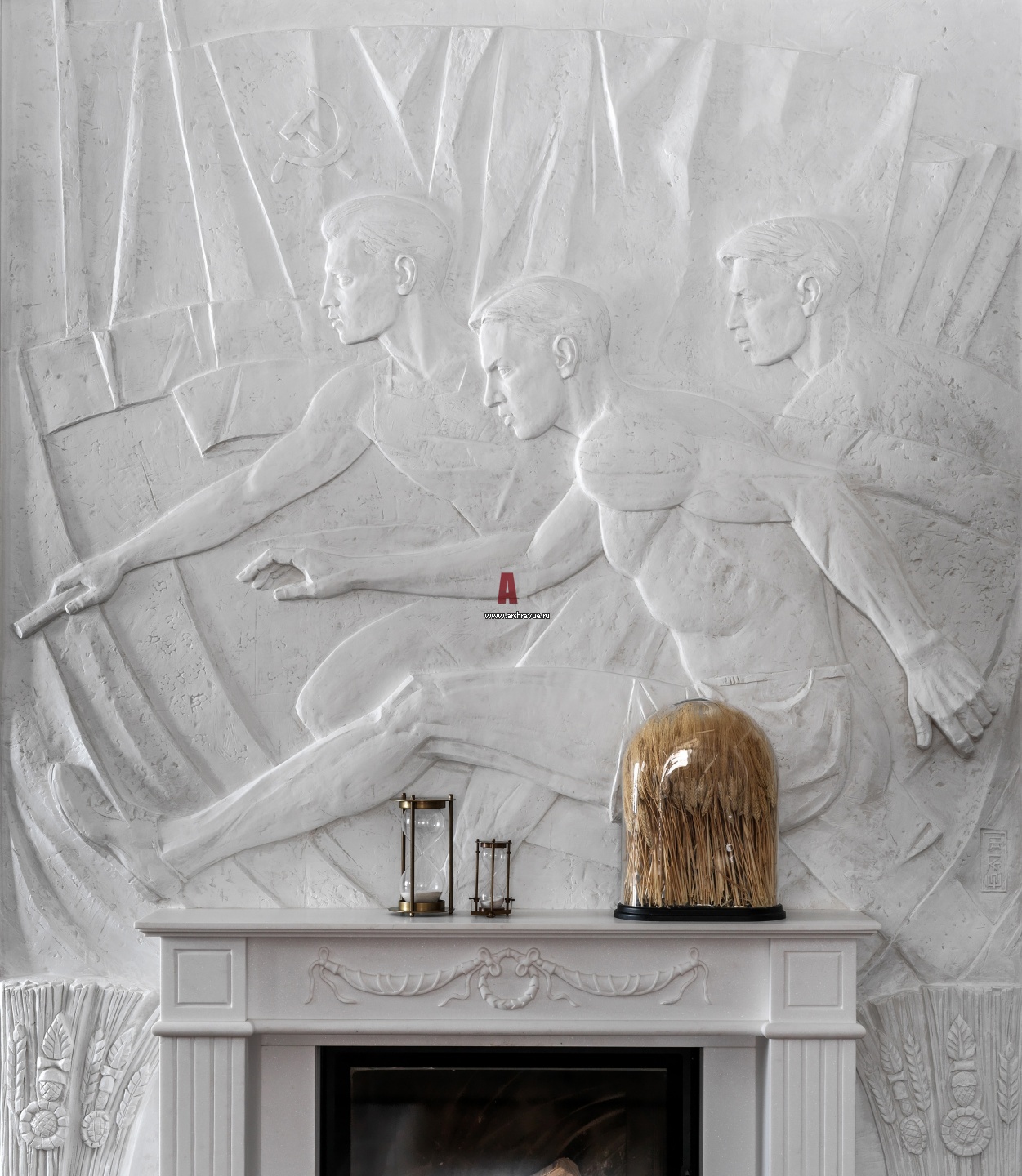 Оформление камина вдохновлено выставкой «Оттепель» и художники Сурового стиля» и работами Дейнеки. Площадь барельефа составляет 18 кв. м, только работа над картонами в натуральный размер заняла полгода, затем последовали 5 месяцев лепки и отливки в гипсе, и, наконец, кропотливый монтаж на объекте.