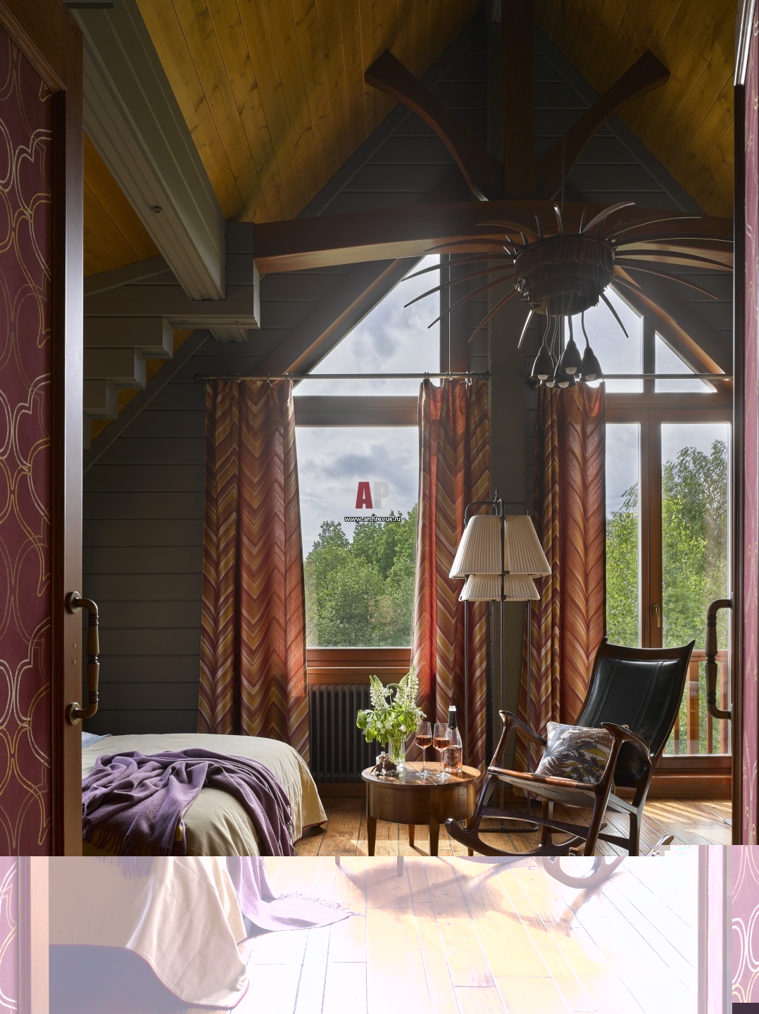 Фрагмент спальни. На полу – массивная доска, американский орех, Lewis & Mark. Торшер, Aldo Bernardi. На окна – испанский текстиль, Decostep.