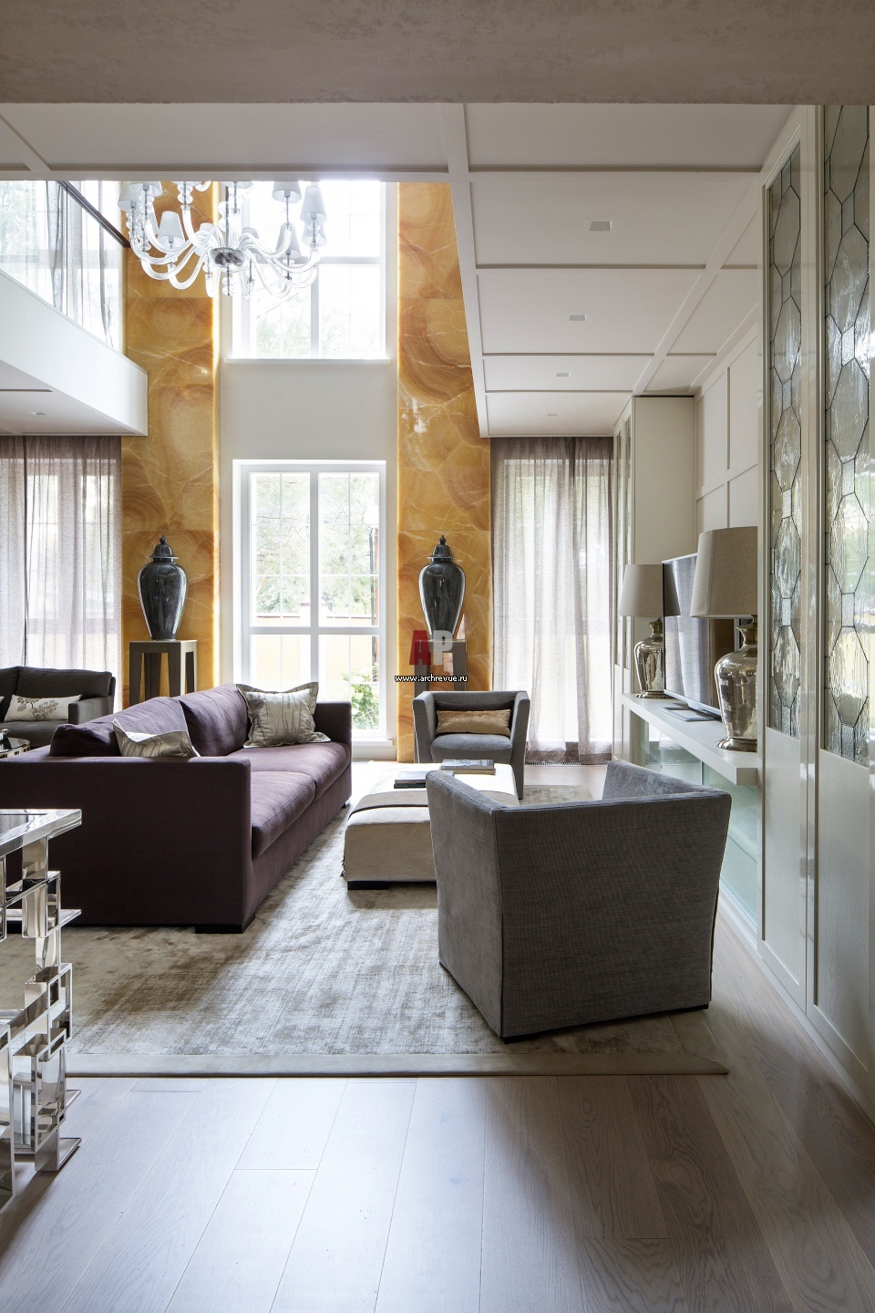Полуколонны из оникса в простенках между онами акцентируют высоту гостиной. Зеркальный шкаф, на заказ.