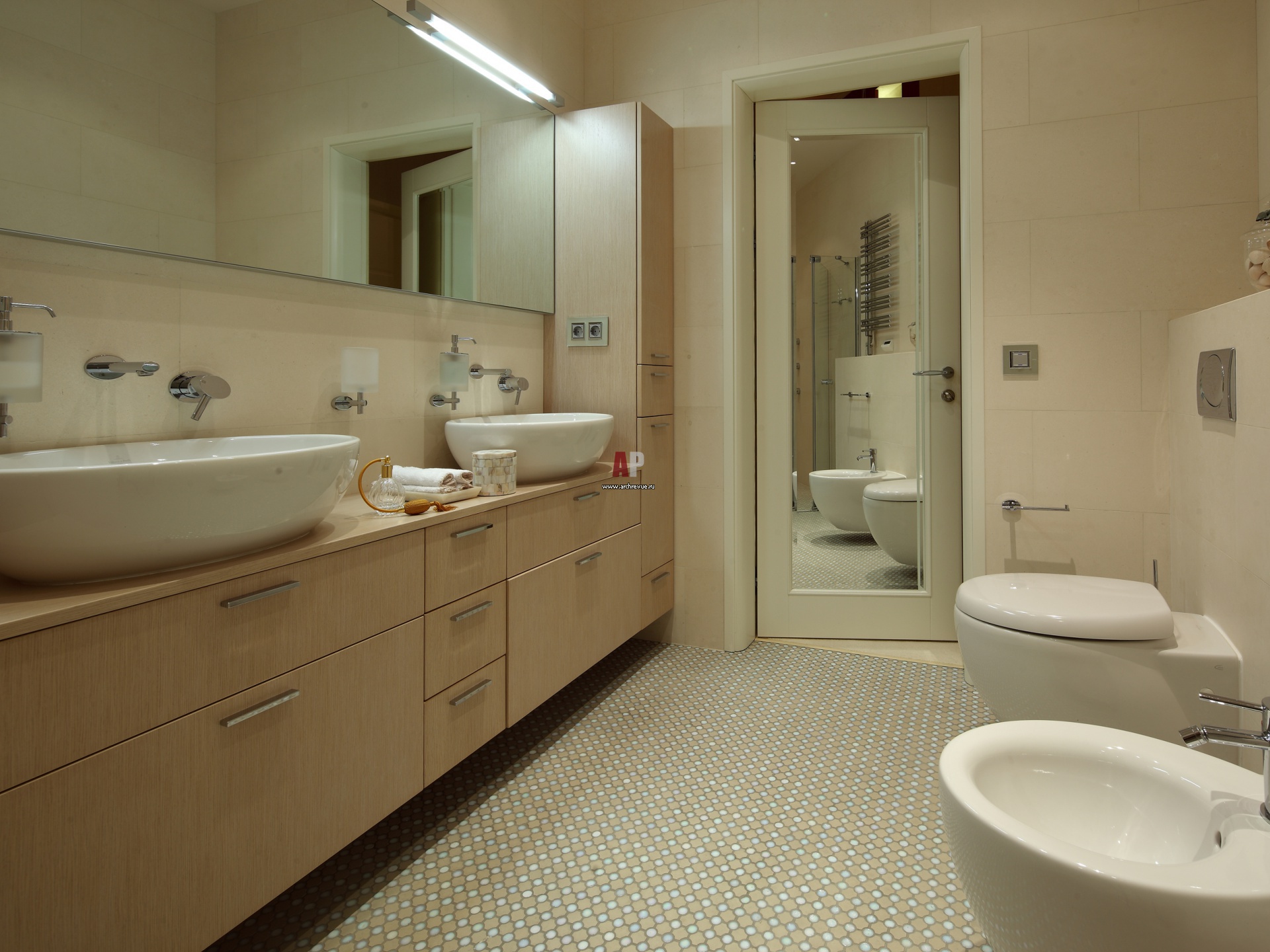 Санузел квартиры в стиле эклектика – самое лаконичное помещение в квартире. Стены и полы облицованы натуральным камнем и мозаикой с перламутром. Раковины, Antonio Lupi.