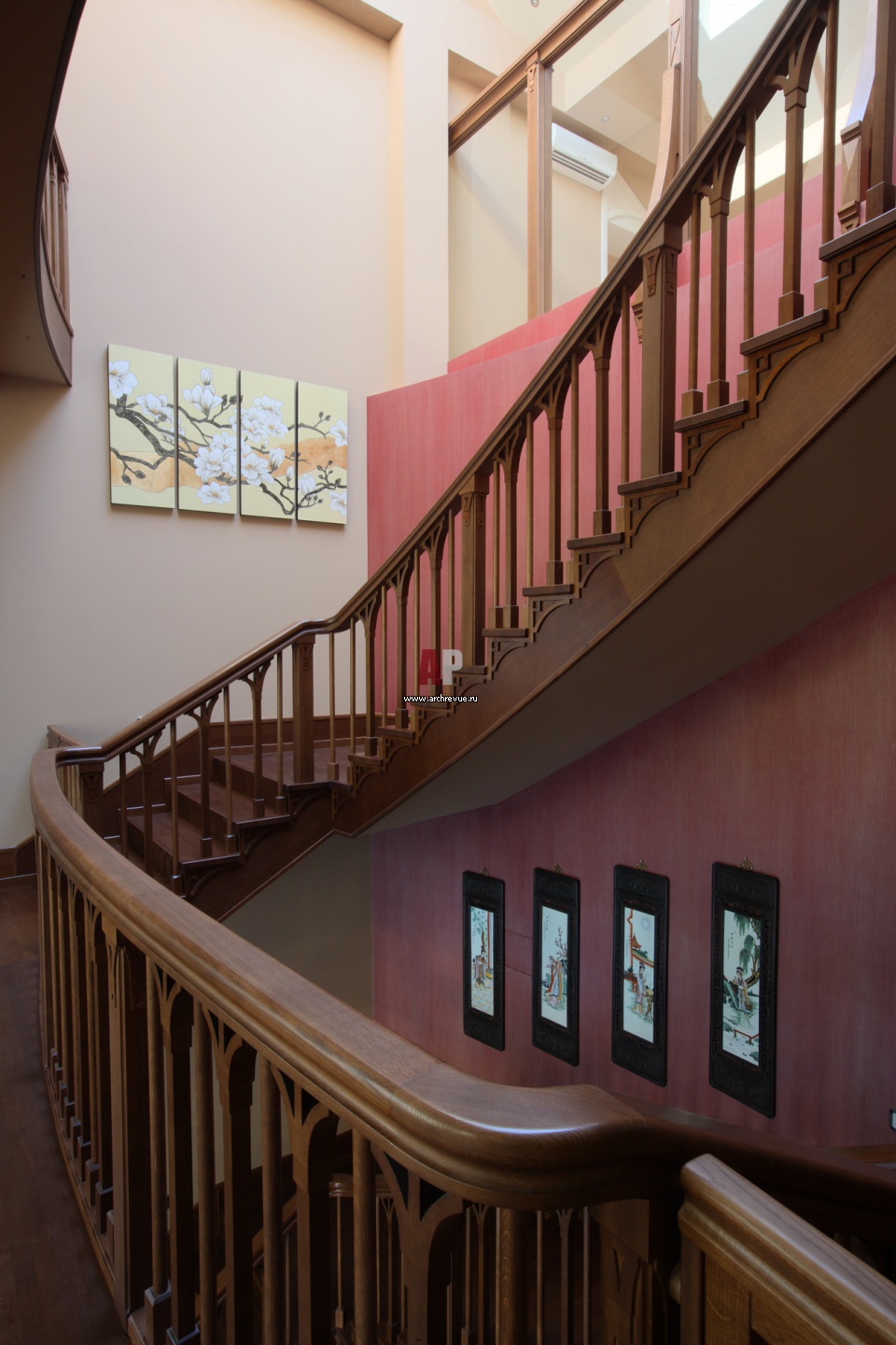 Дубовая лестница с китайской резьбой изготовлена на заказ по эскизам архитекторов мастерами компании «Слюсарев А. Н. ИП».