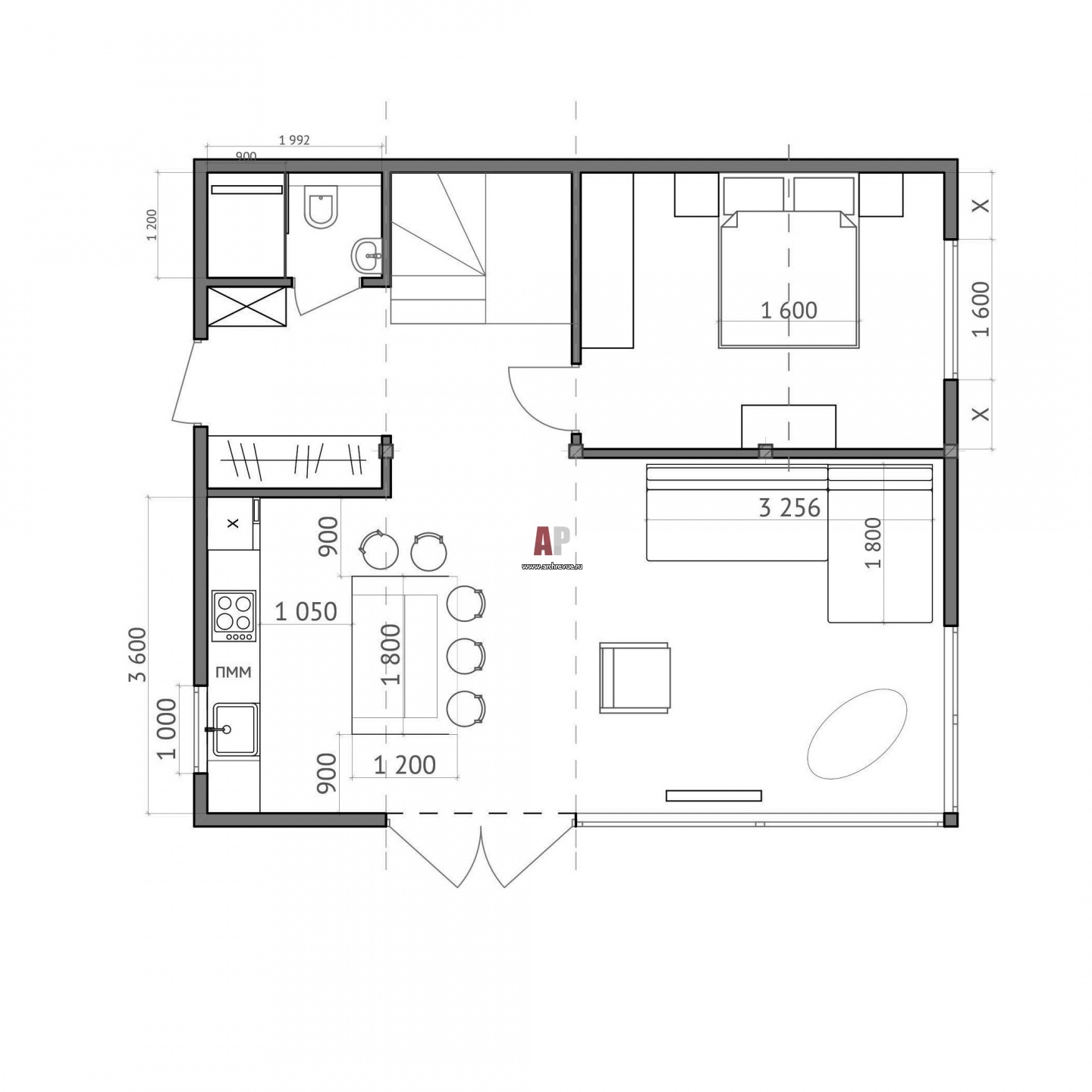 Планировка 1 этажа 2-х этажного дома с видом на горы.