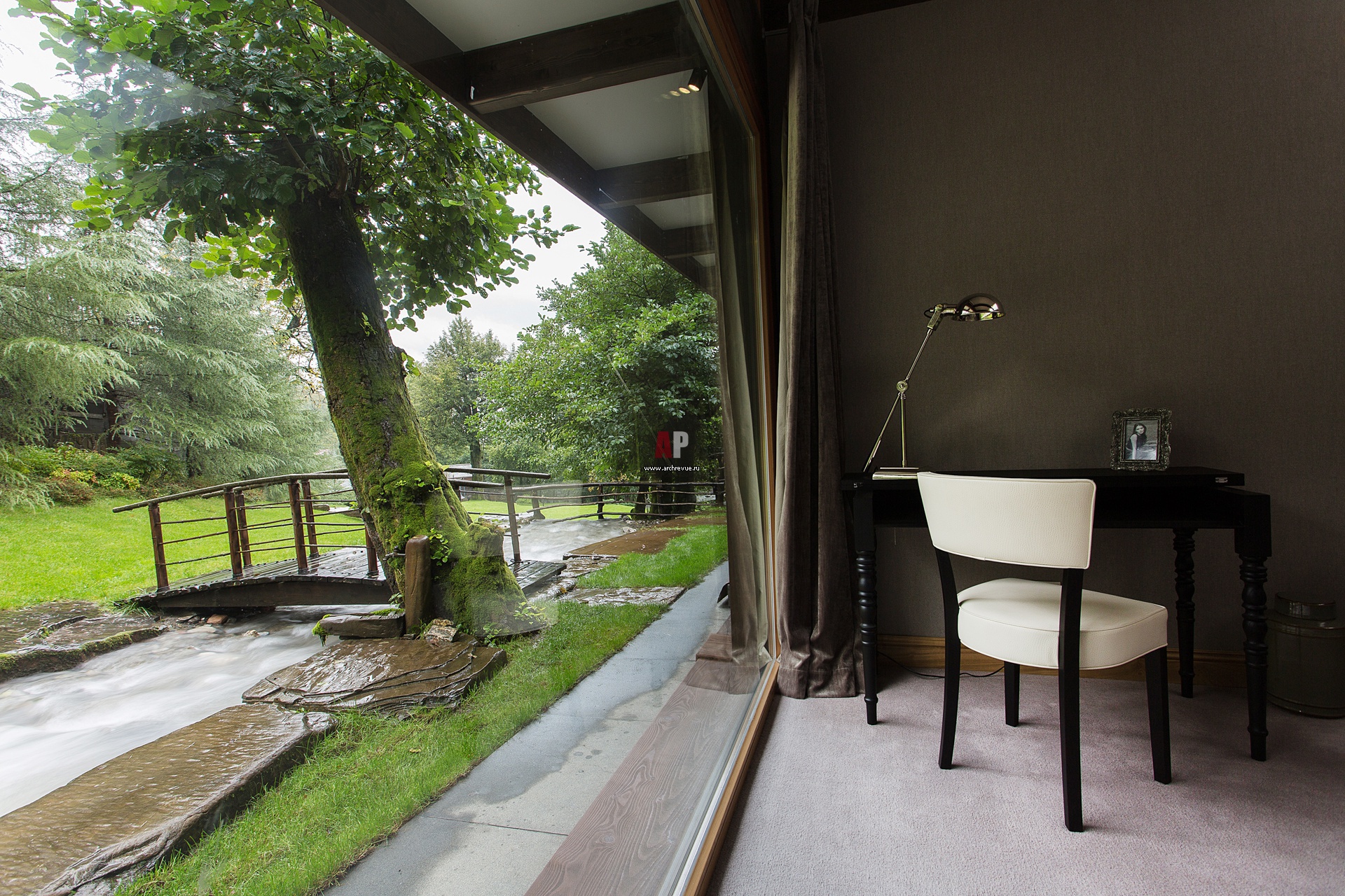 Интерьер спальни с панорамным окном. Стеклянная стена обеспечивает взаимопроникновение интерьера и экстерьера. Соседство с природной красотой дарит не только визуальные ощущения, но и слуховые (ручей грохочет), а также обонятельные. Туалетный столик, MOOOI; стулья, Poliform.