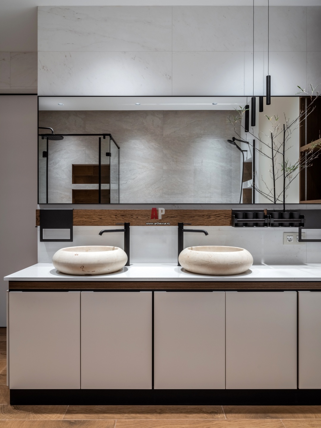Хозяйский санузел. Умывальник, Gamadecor. Круглые раковины изготовлены из камня.