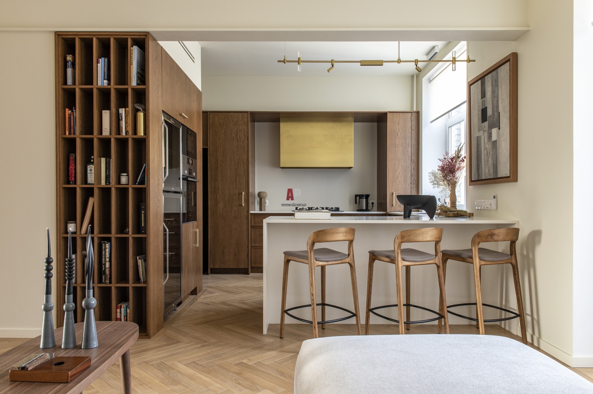 Светлая функциональная квартира с дубовым шпоном и латунной вытяжкой