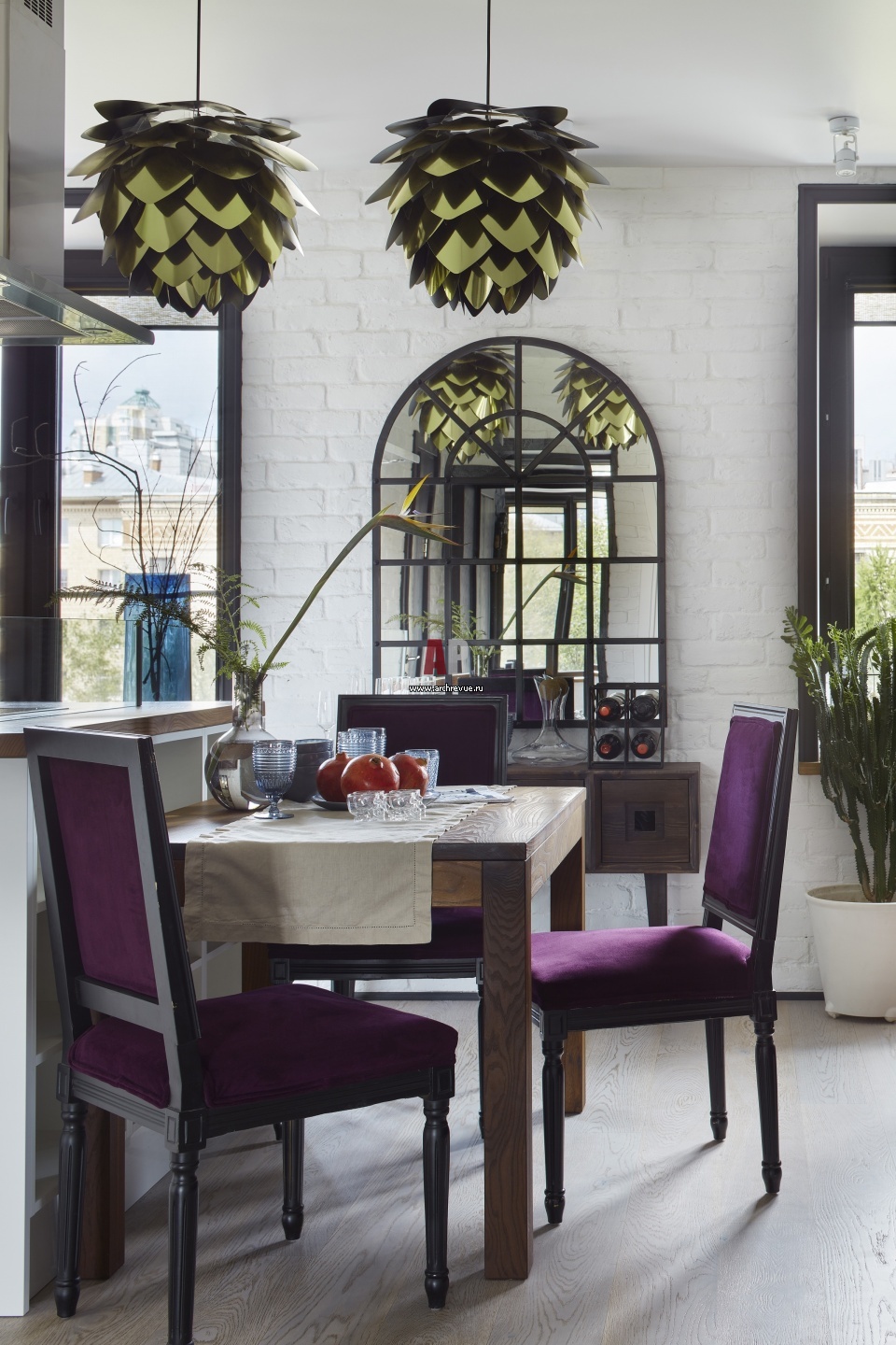 К барному острову примыкает небольшой обеденный стол. Стулья в яркой обивке, DG Home. На стене – арочное зеркало, выполненное на заказ.