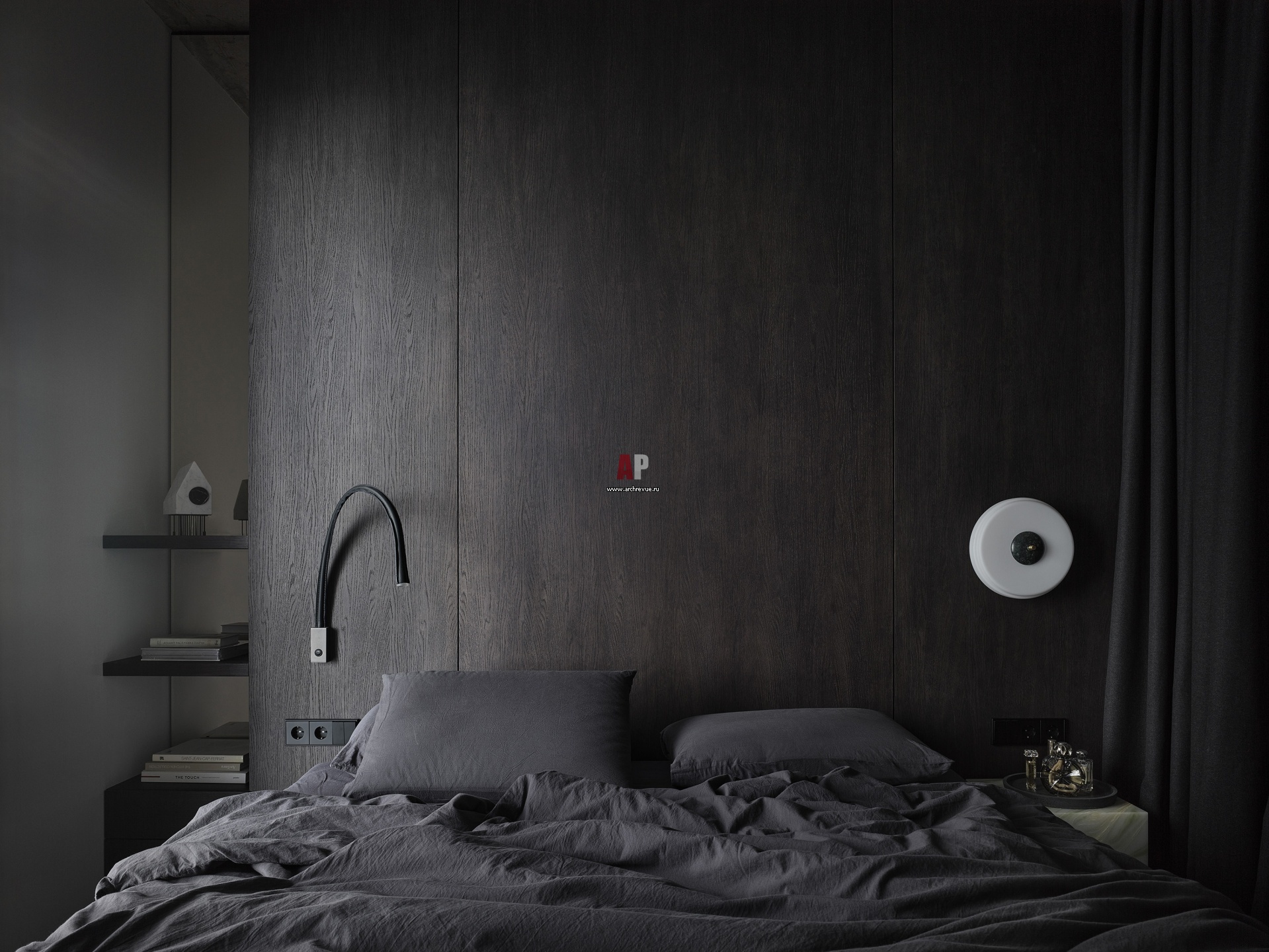 Брутальная спальня с темными стеновыми панелями за изголовьем кровати. Столярные изделия изготовлены на заказ компанией «Ассоциация русских мастеров».