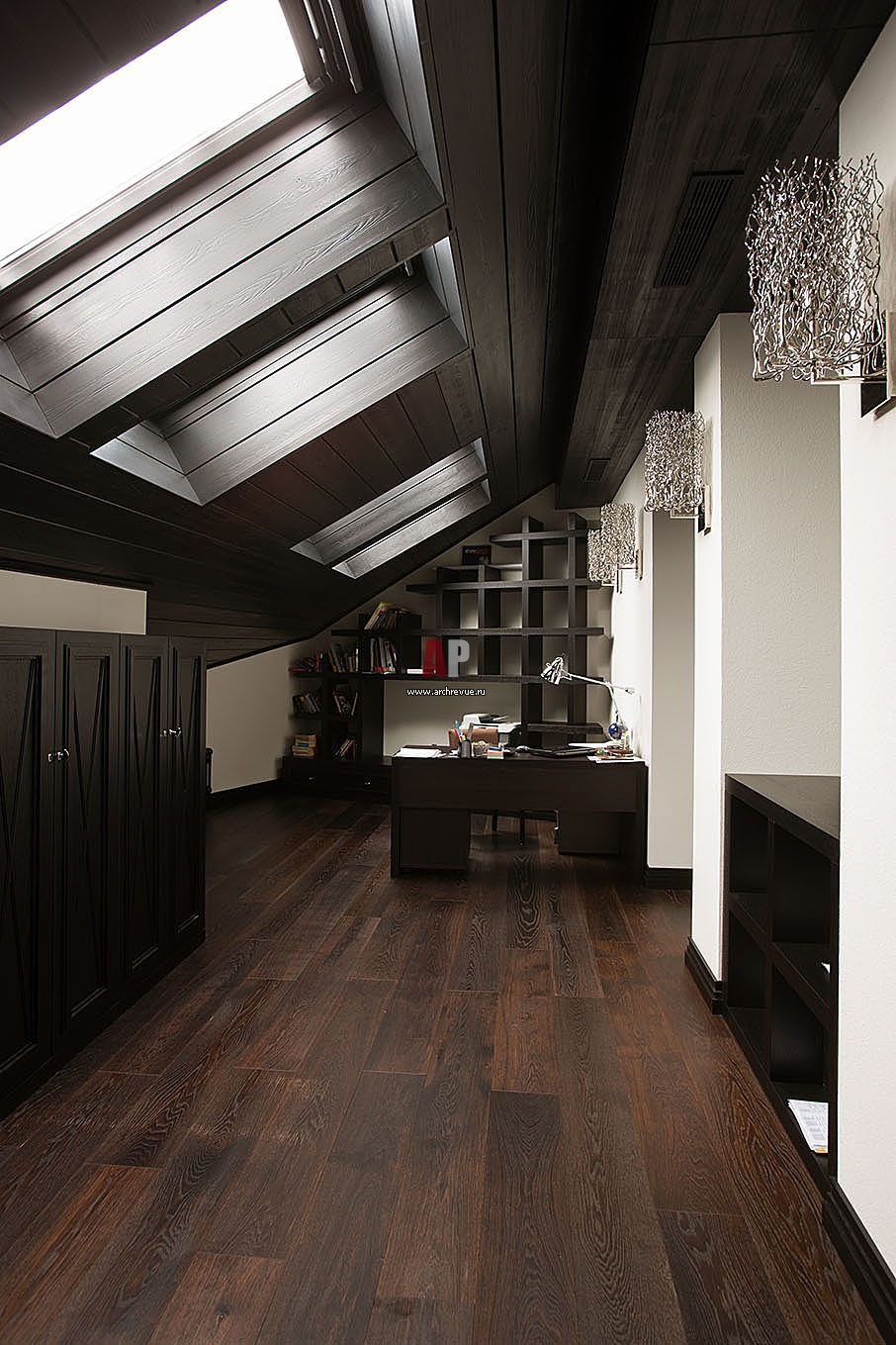 Интерьер кабинета в мансарде. Скос кровли зашит панелями из венге. Стеллаж, стеновые панели, письменный стол, Giorgio Piotto.