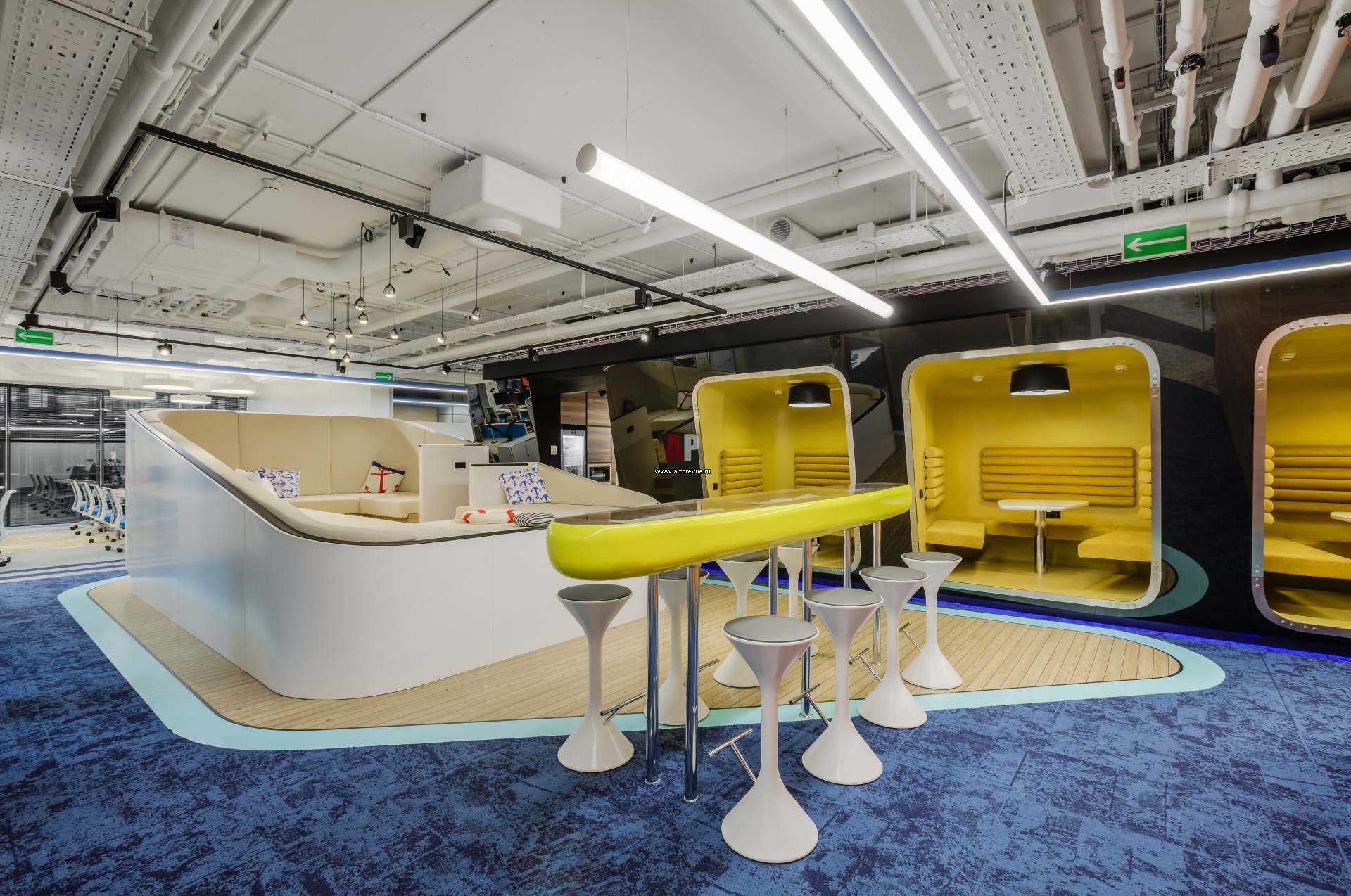 Зона лаунжа с баром в стилистике футуристической яхты. Чтобы переоборудовать зал столовой, не нужно выносить столы. Также как на яхте, с помощью специальных лебедок поднимаются паруса, освобождая место для вечеринок или других событий, в столовой лебедки поднимают столы к потолку.