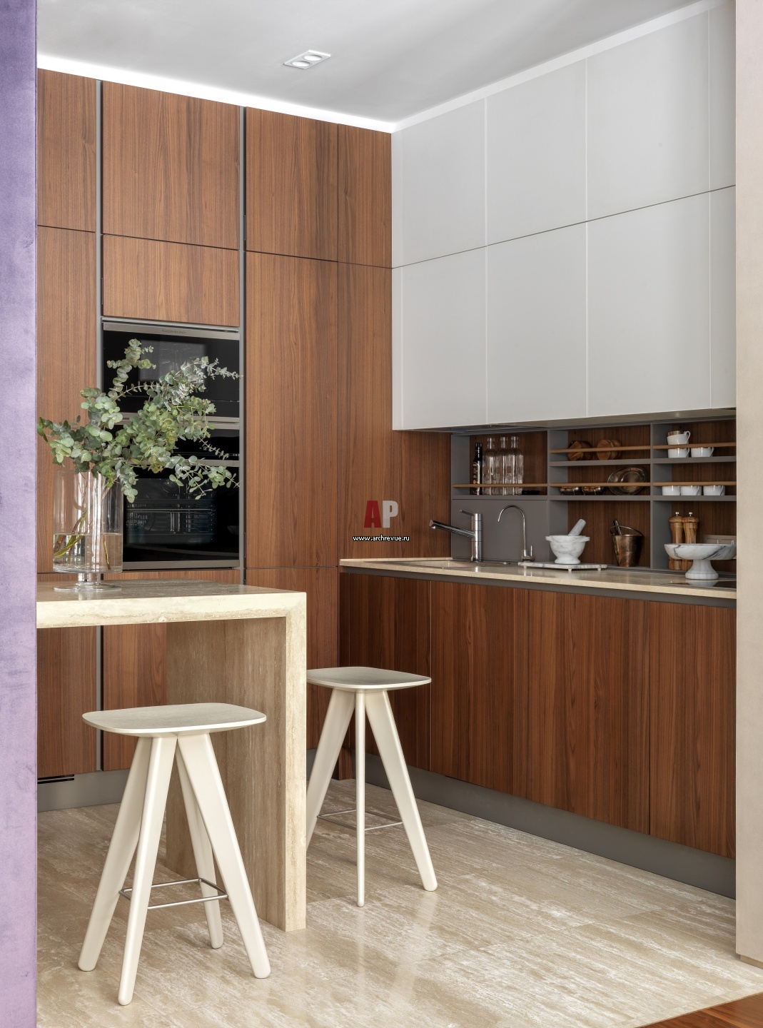 Зона кухни в общей гостиной. Кухня, Poliform. Барная стойка в строительном исполнении из травертина. Барные табуреты, Poliform.