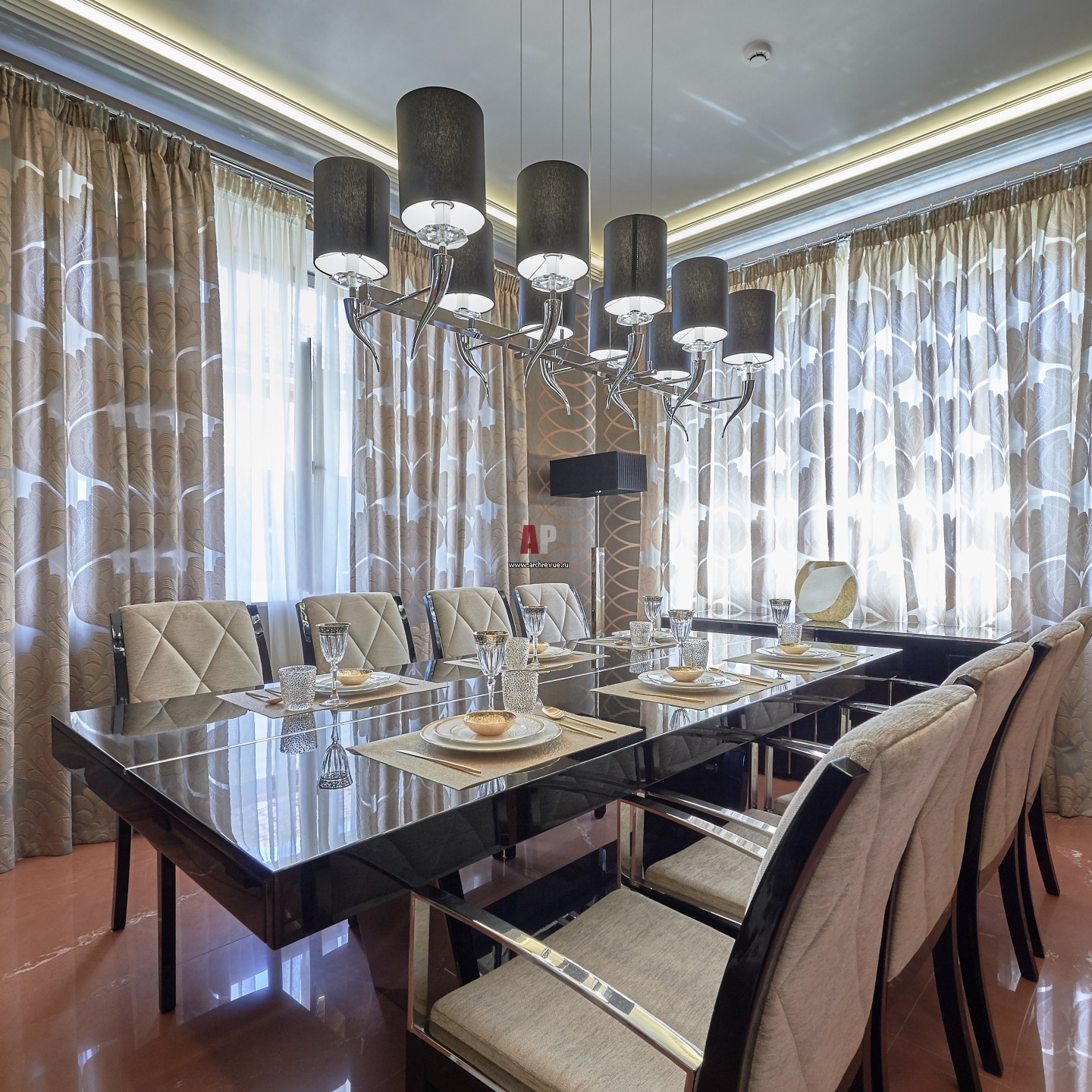 Интерьер столовой группы в стиле сдержанного ар-деко. Обеденный стол, стулья, центральный светильник, Malerba.