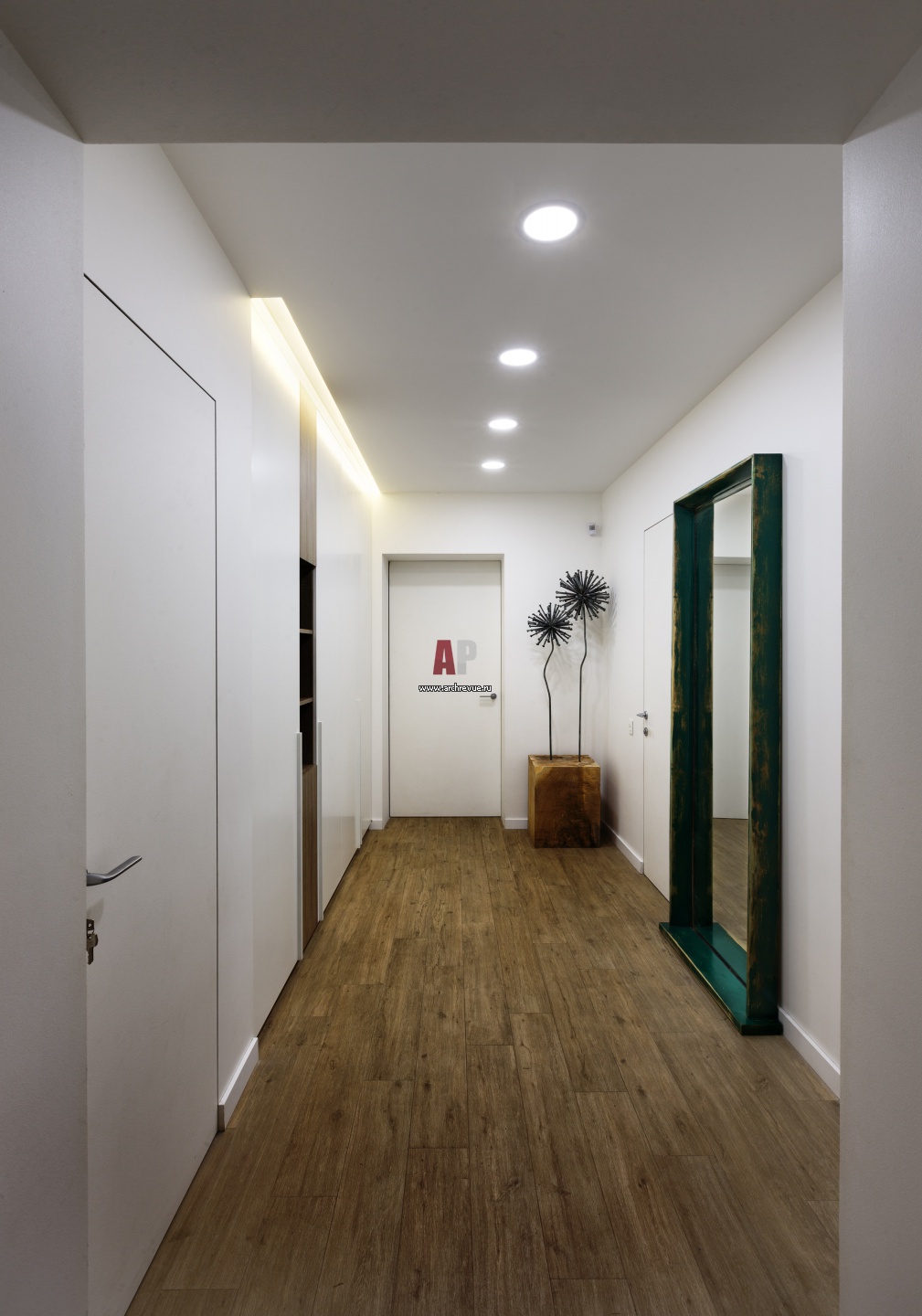 Декоративные акценты белой прихожей – зеркало до пола в раме из искусственно состаренного дерева, а также скульптура из дерева и металла в виде кадки с растениями.
