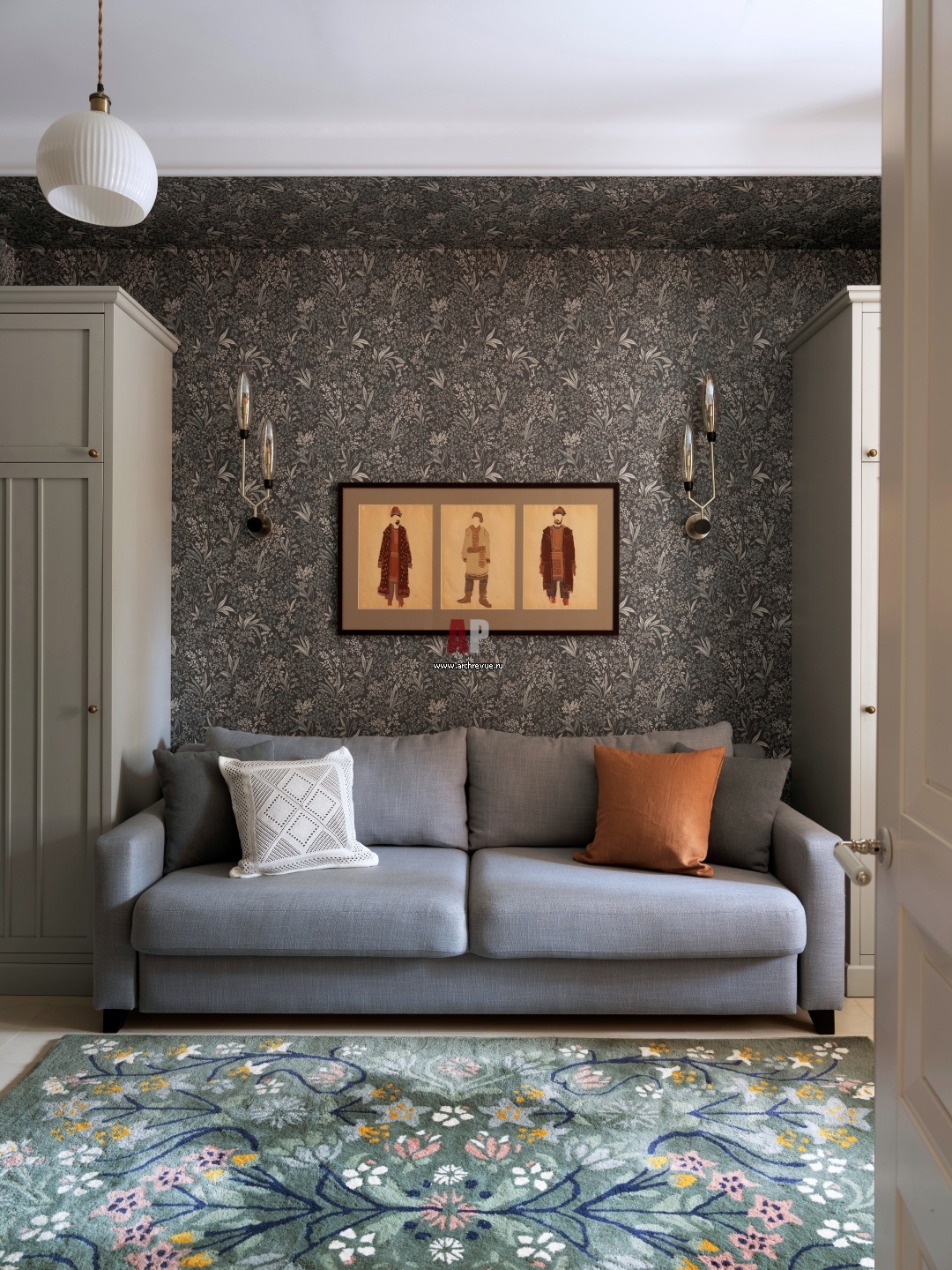 Кабинет на первом этаже. Стены оформлены богато орнаментированными скандинавскими обоями. На стене – эскизы костюмов художника-постановщика Эдуарда Галкина. Они были найдены и приобретены для заказчиков из личной коллекции дизайнера-декоратора Дины Масленниковой.