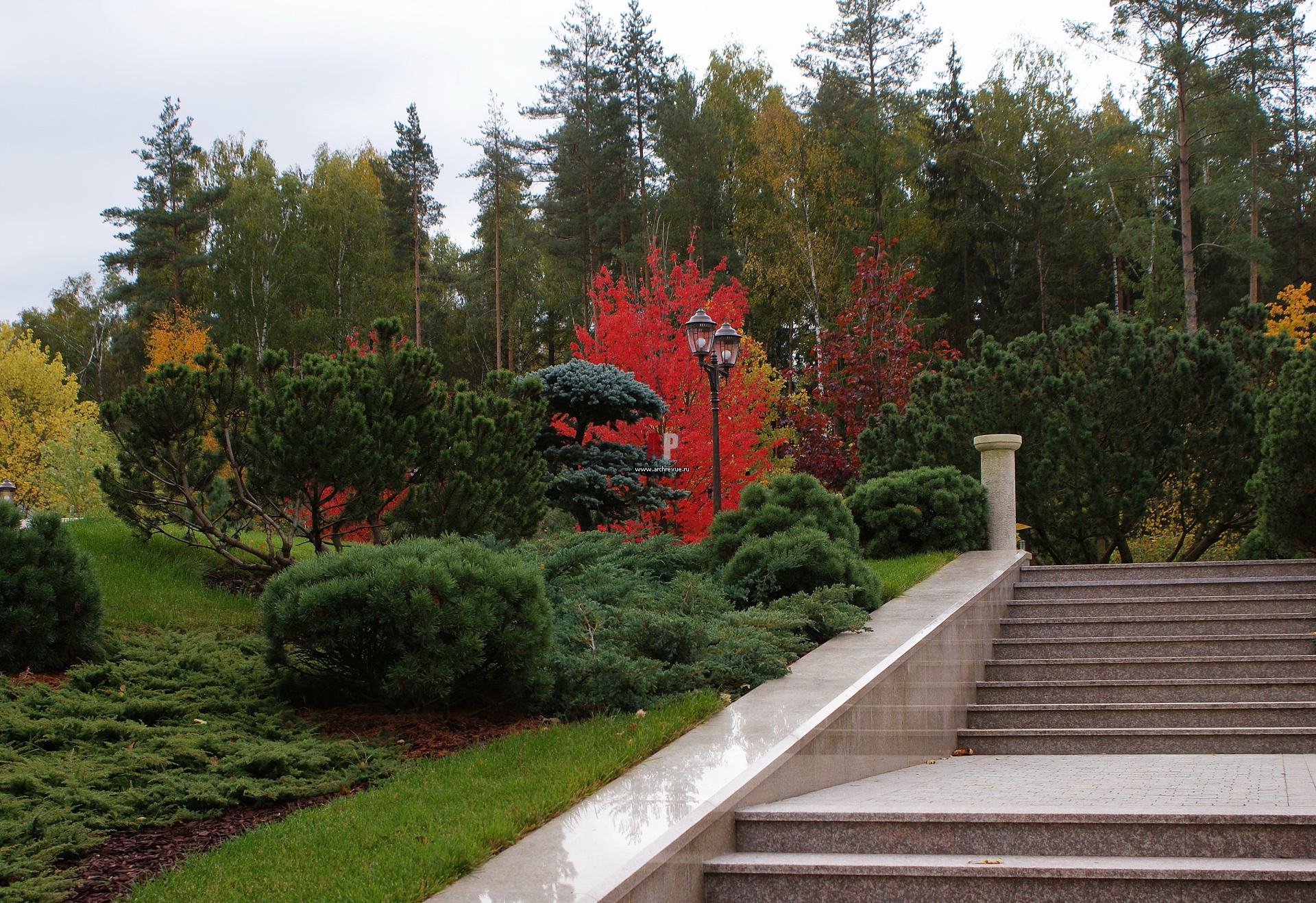 Склон вдоль парадной каменной лестницы засажен хвойными растениями и спиреей.