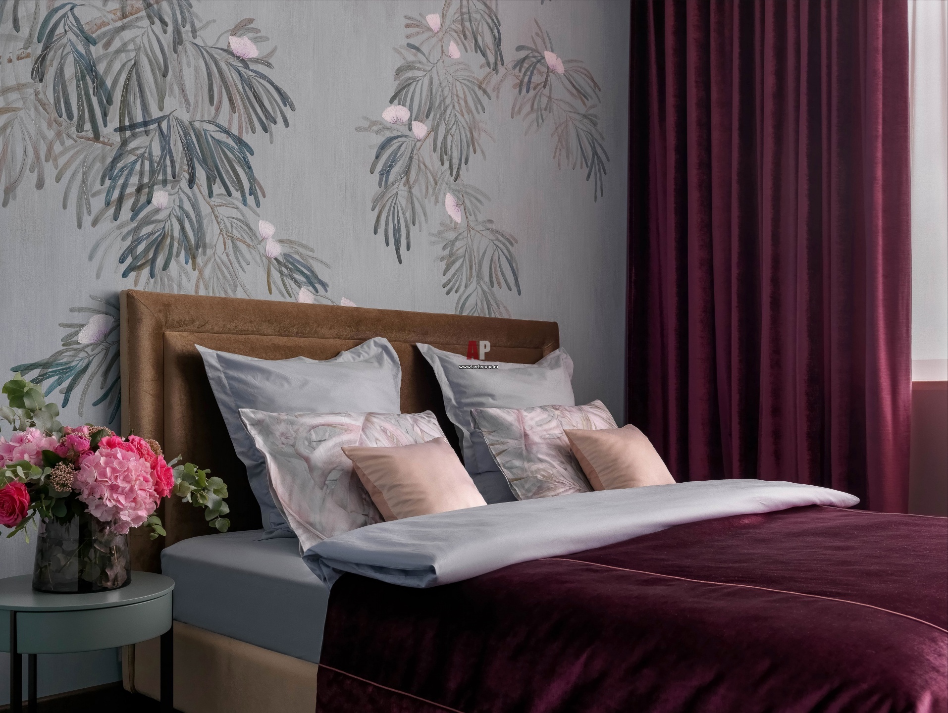 Интерьер хозяйской спальни. Изначально дизайнер хотела сделать акцентом стену за изголовьем кровати, а портьеры и текстиль не выделять цветом, но заказчица предложила сместить фокус как раз на кровать и выбрала бархат свекольно-баклажанного оттенка. Кровать, Estetica. Столики, Lema, модель Sing.